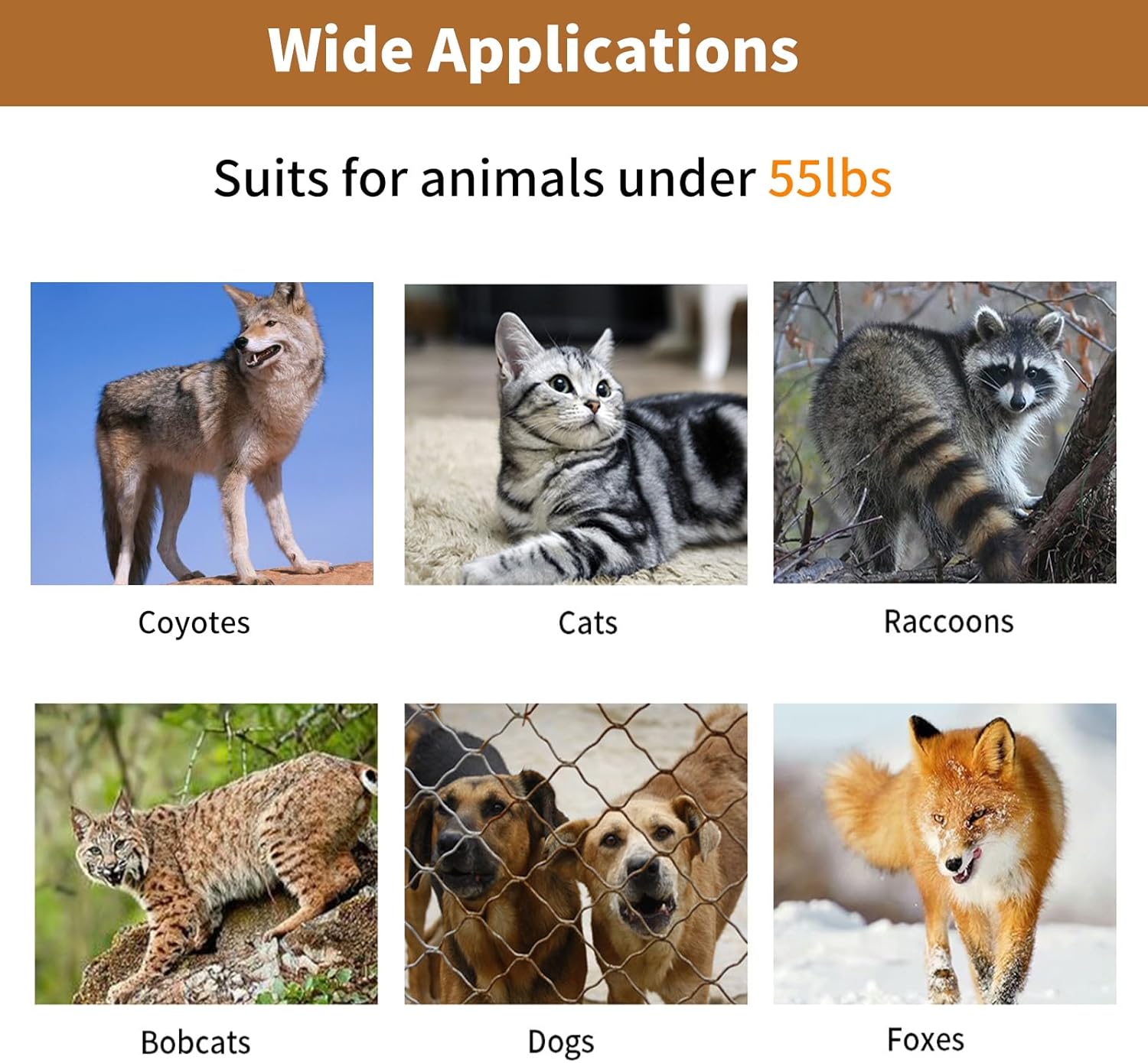 Wide Application: Measures 57 * 18.5 * 20.66 inches. Suitable for dogs, foxes, coyotes, bobcats and similar sized animals up to 55 pounds
