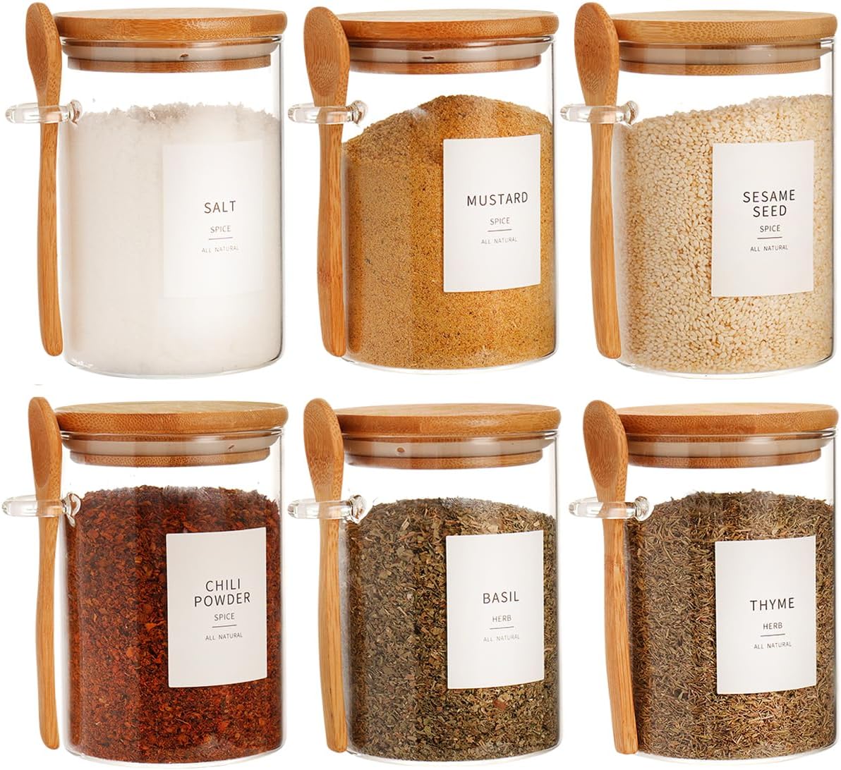6 Pcs Glass Jar with Bamboo Lid and Spoon - 17 oz Large Sugar Container with 148 Kitchen Pantry Spice Jar Labels Preprinted - Glass Containers with Wooden Lids Hold Coffee, Tea, Candy