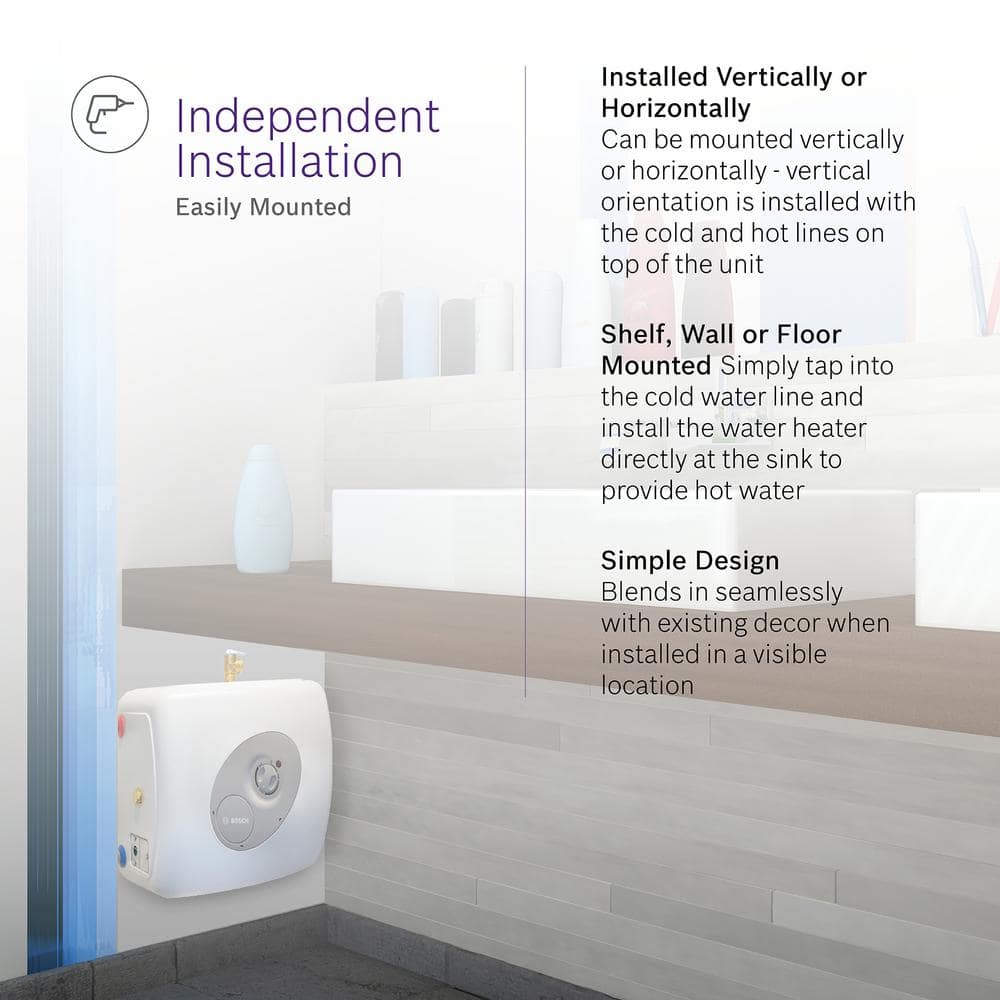 The Bosch 7 Gal. electric water heater has a 7 Gal. mini tank that fits under your sink to provide hot water right where you need it- at the point of use. The heater must be hardwired into your home's electrical system and has a lightweight, compact design. A glass-lined tank offers great insulation, while the heater's fast recovery rate eliminates long waits for hot water. A temperature-and-pressure relief valve enhances your safety.. Amperage (A): 12 A. Application Type: Point of Use. Efficiency Level: Super High. Finish Family: White. Fuel Type: Electric. Household Size: 1-2. Indoor/Outdoor: Indoor. Maximum Temperature (F): 145 F. Minimum Temperature (F): 65 F. Nominal Tank Capacity (gallons): 7 gal. Pack Size: 1. Product Weight (lb.): 29.5 lb. Rated Tank Capacity (gallons): 7 gal. Required Volt Connection: 120 volt. Returnable: 90-Day. Tank Lining Material: Glass. Uniform Energy Factor: 0.94. Water Connection Location: Top. Water Heater Features: Glass-Lined Tank,Overheat Protection,Wall Mounted. Water Heater Profile: Compact. Water Heater Type: Electric. Wattage (watts): 1440 W. Certifications and Listings: CSA Listed,UL Listed. Product Depth (in.): 14.5 in. Product Height (in.): 17.6 in. Product Width (in.): 17.6 in. Tank Valve Size (in.): 0.75 in. Water Connection Size (in.): 3/4 in