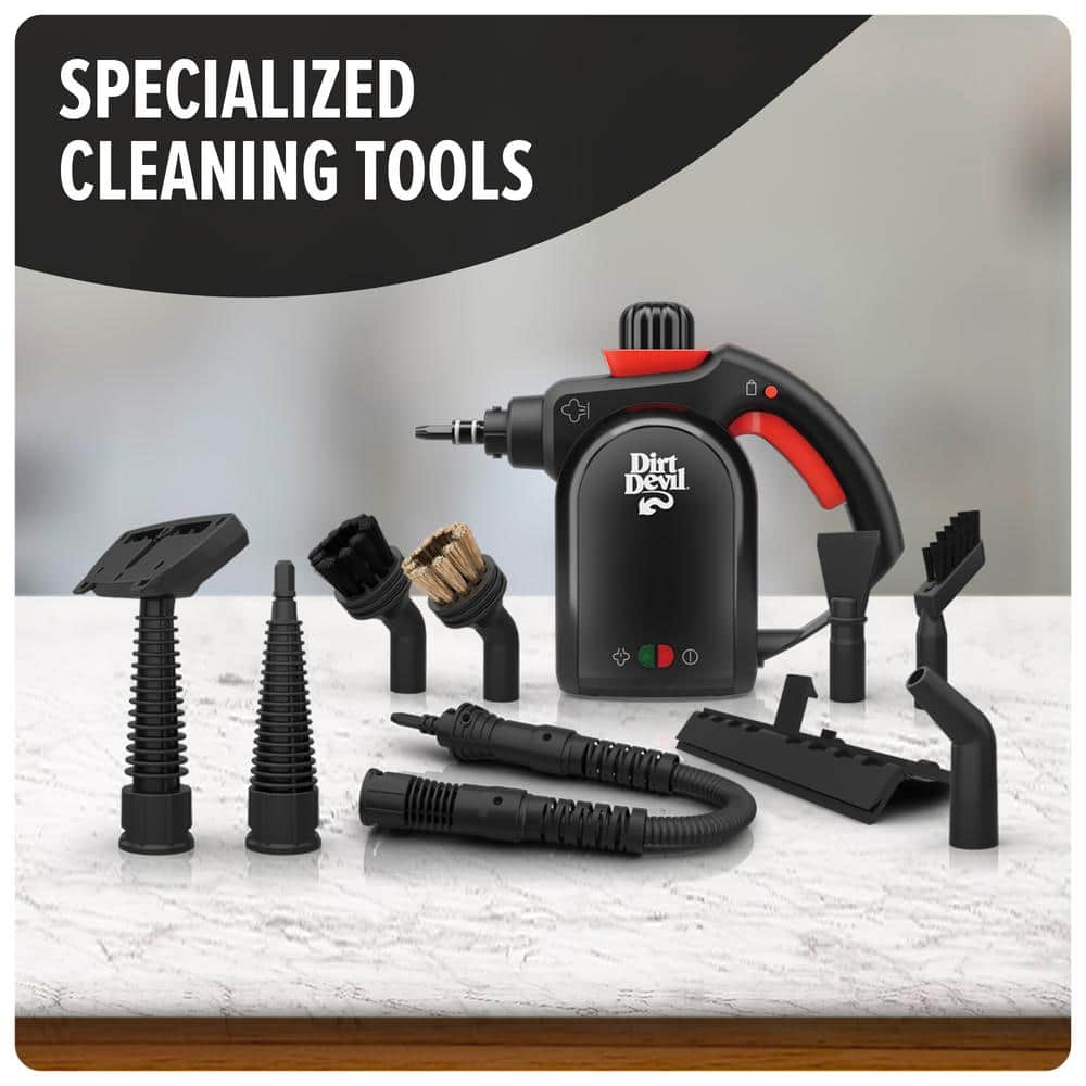 The Dirt Devil Handheld Steamer is a versatile cleaning solution harnessing the power of steam. With specialized attachments, effortlessly tackle dirt on appliances, kitchen surfaces and more. The no-spill reservoir ensures a hassle-free cleaning experience, while the compact design allows for easy maneuverability. Upgrade your cleaning routine with the Dirt Devil Handheld Steam Cleaner and experience the effective and efficient power of steam.. Amperage (A): 0 A. Appliance Category: Floor Care. Appliance Series: Not Applicable. Assembly Required: No. Brush Included: Brass Brush. Bundling Options: Tool Only. Color Family: Black. Commercial/Residential: Residential. Cord Length (ft.): 16.4 ft. Cordless/Corded: Corded. Floor Care Features: No Additional Features. Heat Time: 2 minutes. Horsepower (hp): 0 hp. Included Accessories: Adaptor,Hose,Squeegee,Upholstery Tool. Material: Plastic. Noise Level (dB): 0. Number of Attachments: 9. Number of Cleaning Nozzles: 8. Number of Cleaning Pads: 0. Operation Style: Handheld. Product Weight (lb.): 5.72 lb. Recommended Surfaces: Hardwood/Wood Laminate,Marble,Tile. Returnable: 90-Day. Voltage (v): 120v. Water Capacity (qt.): 0.26 qt. Wattage (W): 0 W. Certifications and Listings: AHAM Certified. Product Depth (in.): 12 in. Product Height (in.): 9.5 in. Product Width (in.): 5 in. Recommended Surfaces: Hardwood/Wood Laminate. Recommended Surfaces: Tile. Recommended Surfaces: Marble. Included Accessories: Squeegee. Included Accessories: Upholstery Tool. Included Accessories: Hose. Cordless/ Corded: Corded. Cordless/Corded: Corded