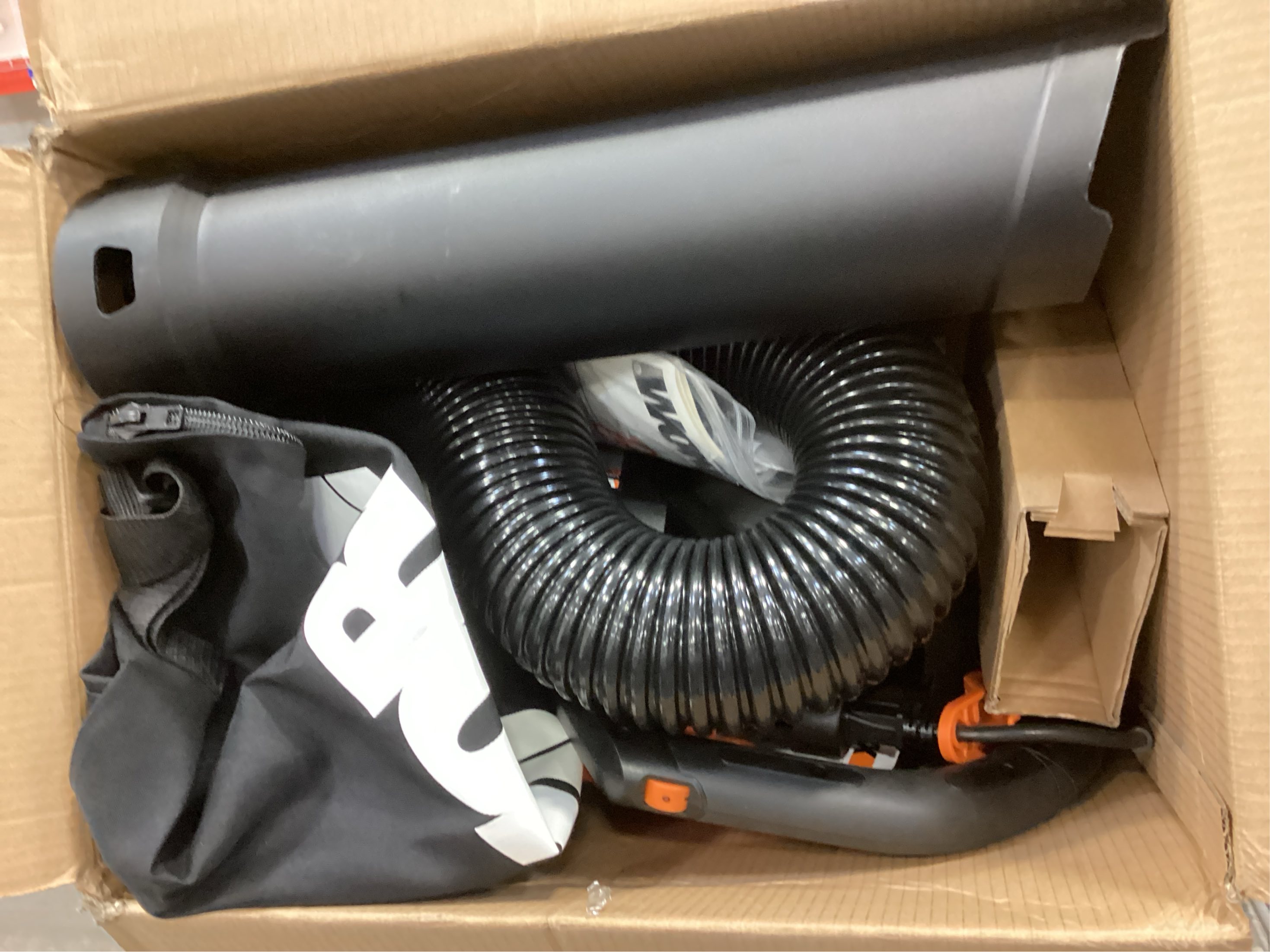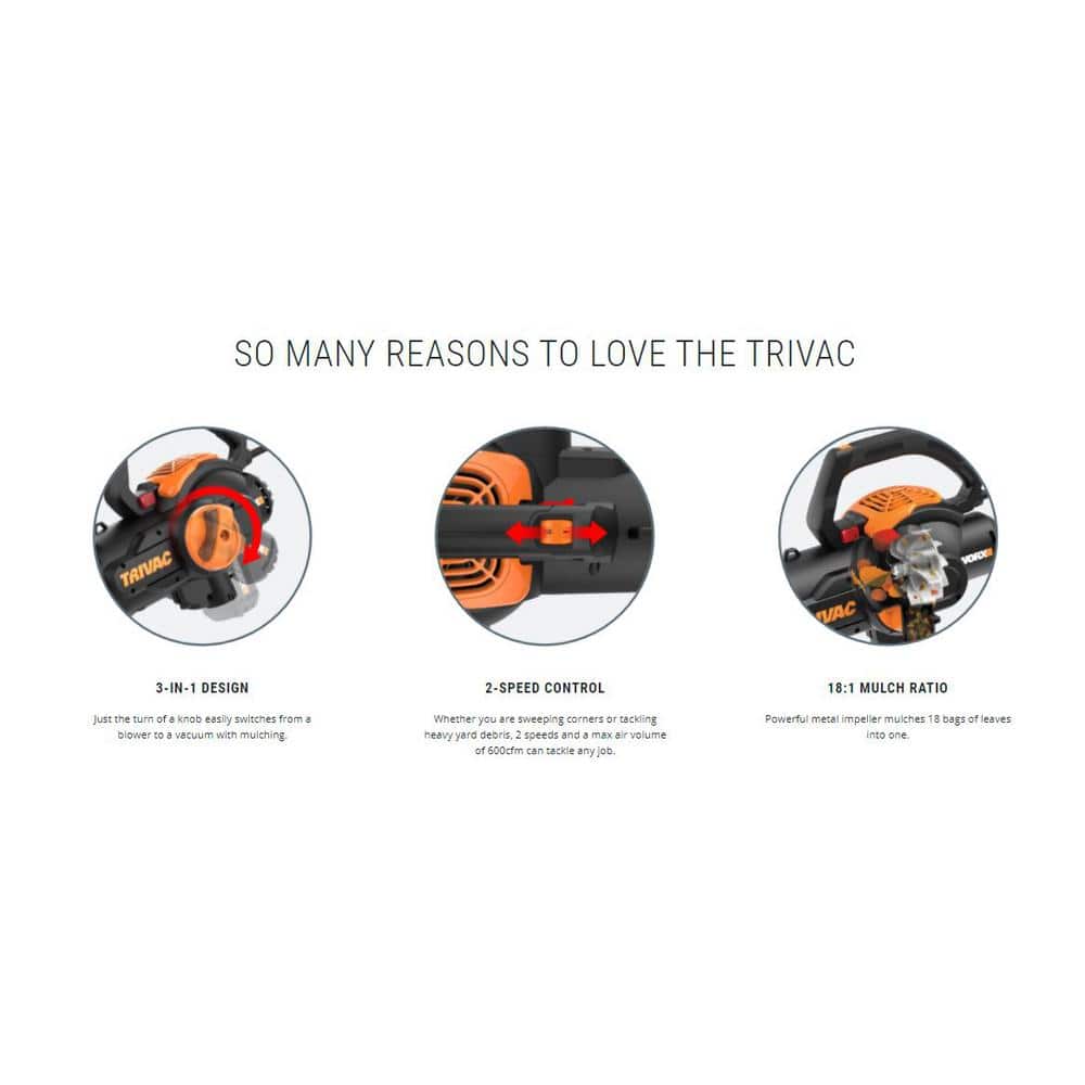 The Worx TRIVAC is the easy-to-use, All-in-1 system for blowing, vacuuming, and mulching leaves. No stopping to change tubes and no downtime to switch from a blower to a vac. This machine does it all with a flip of a switch and no tools. The balanced single hand operation makes it easier to maneuver and control without much fatigue. The TRIVAC delivers up to 600cfm of blower force power with a hi-impact metal impeller. The included collection bag holds up to 1.2-bushels of mulched debris. With the TRIVAC's powerful 12 Amp motor, this tool makes an efficient alternative to gasoline powered tools. There is no downtime with the TRIVAC -- blow the leaves into a pile; vac and mulch them; and dump the bag for compost or collection.. Amperage (A): 12. Blower Type: Handheld. Commercial: No. Engine Type: Electric Motor. Features: Adjustable Speed,Antivibration,Leaf Vacuum,Mulching,Translucent Fuel Tank. Included: Bag,Vacuum Kit. Included Accessories: Bag,Vacuum Kit. Maximum Air Volume (CFM): 620. Maximum air speed (mph): 70. Noise rating (dB): 50. Power Type: Corded. Product Weight (lb.): 9.28 lb. Refurbished: Yes. Required extension cord rating: 12 gauge. Returnable: 90-Day. Start Type: Electric. Tools Included: Blower. Vacuum Capability: No Vacuum Capability. Certifications and Listings: ETL Listed. Maximum extension cord length (ft.): 100 ft. Product Depth (in.): 20.28 in. Product Height (in.): 15.55 in. Product Width (in.): 13.98 in