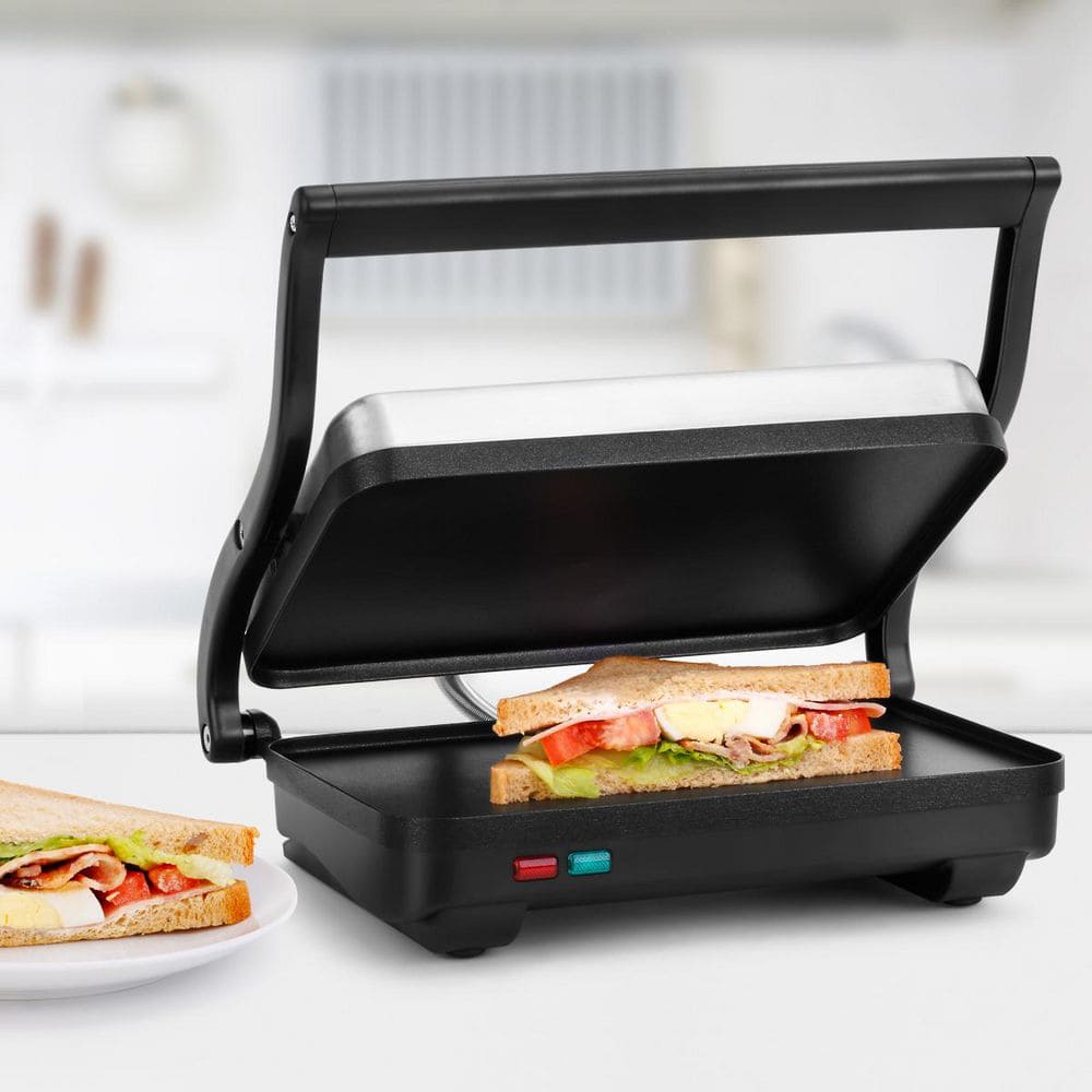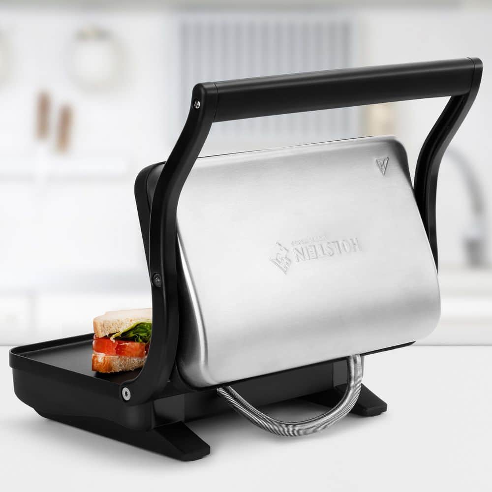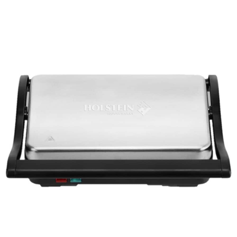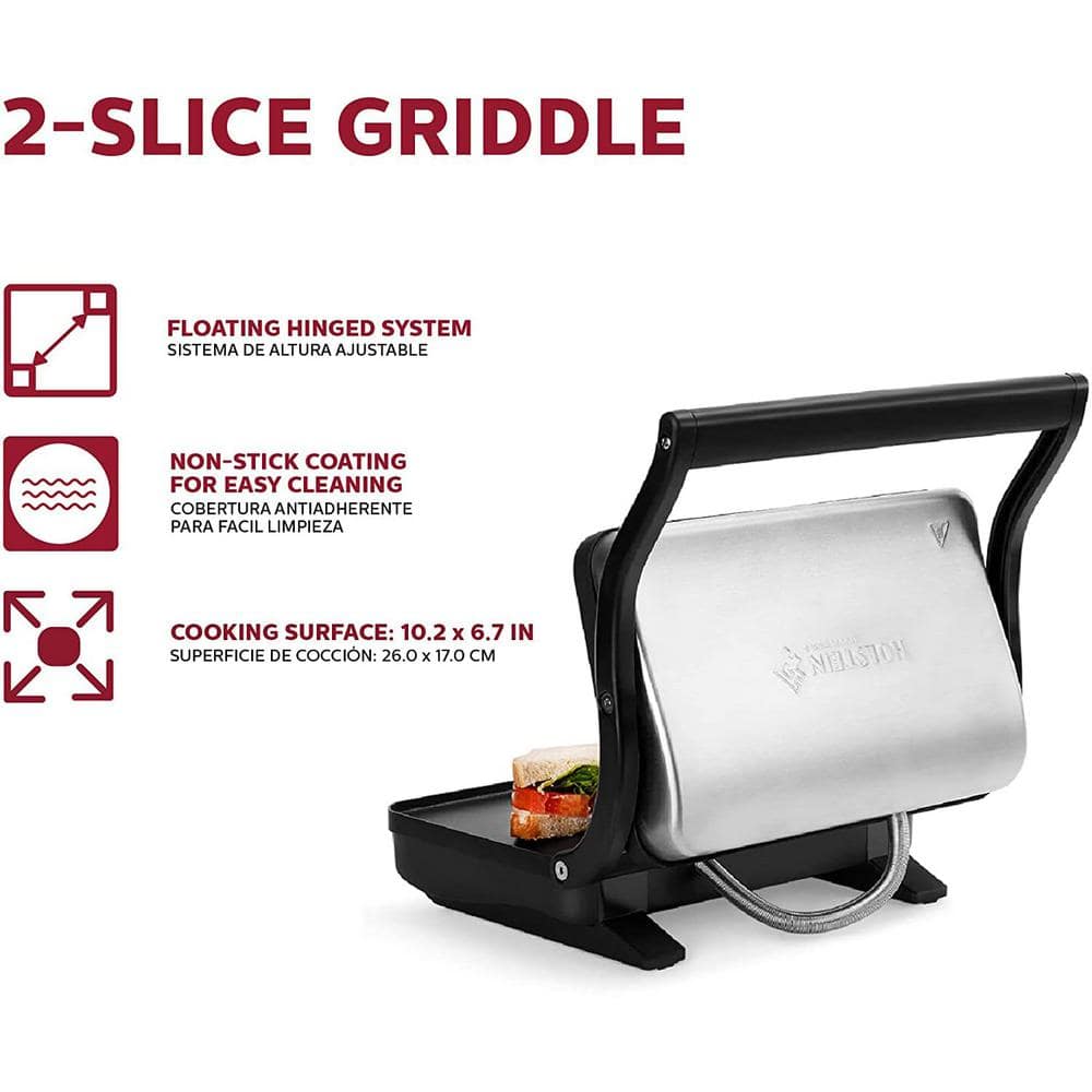 Golden and crispy sandwiches at your fingertips with Holstein Housewares 2-Slice Griddle! It features a non-stick coating for easy cleaning and the top hinged plate adjusts to fit the thickness of what you are pressing. Create at home tasty meals with crispy edges and crunchy sandwiches with melted cheese in minutes. The brushed stainless steel upper housing detailing makes it a perfect addition to any kitchen. The Holstein Housewares 2-slice griddle will simplify your life in the kitchen.. Appliance Series: Not Applicable. Appliance Type: Electric Griddle. Color/Finish: STAINLESS STEEL. Color/Finish Family: Black Stainless Steel. Commercial Use: Residential. Cooking Area (sq. in.): 70. Features: Non-Stick Interior,On Indicator Light. Housing Material: Stainless steel. Includes: Recipe Book. Number of Temperature/Cooking Controls: 1. Pan Shape: Rectangle. Product Weight (lb.): 4 lb. Returnable: 90-Day. Small Appliances Color Family: Black. Small Electric Product Type: Electric Griddle. Wattage (W): 1000 W. Certifications and Listings: ETL Listed. Product Depth (in.): 10.08 in. Product Height (in.): 4.72 in. Product Width (in.): 11.42 in. Commercial Use: Residential. Cooking Area (sq. in.): 70. Pan Shape: Rectangle. Wattage (W): 1000 W. Appliance Type: Electric Griddle. Features: Non-Stick Interior