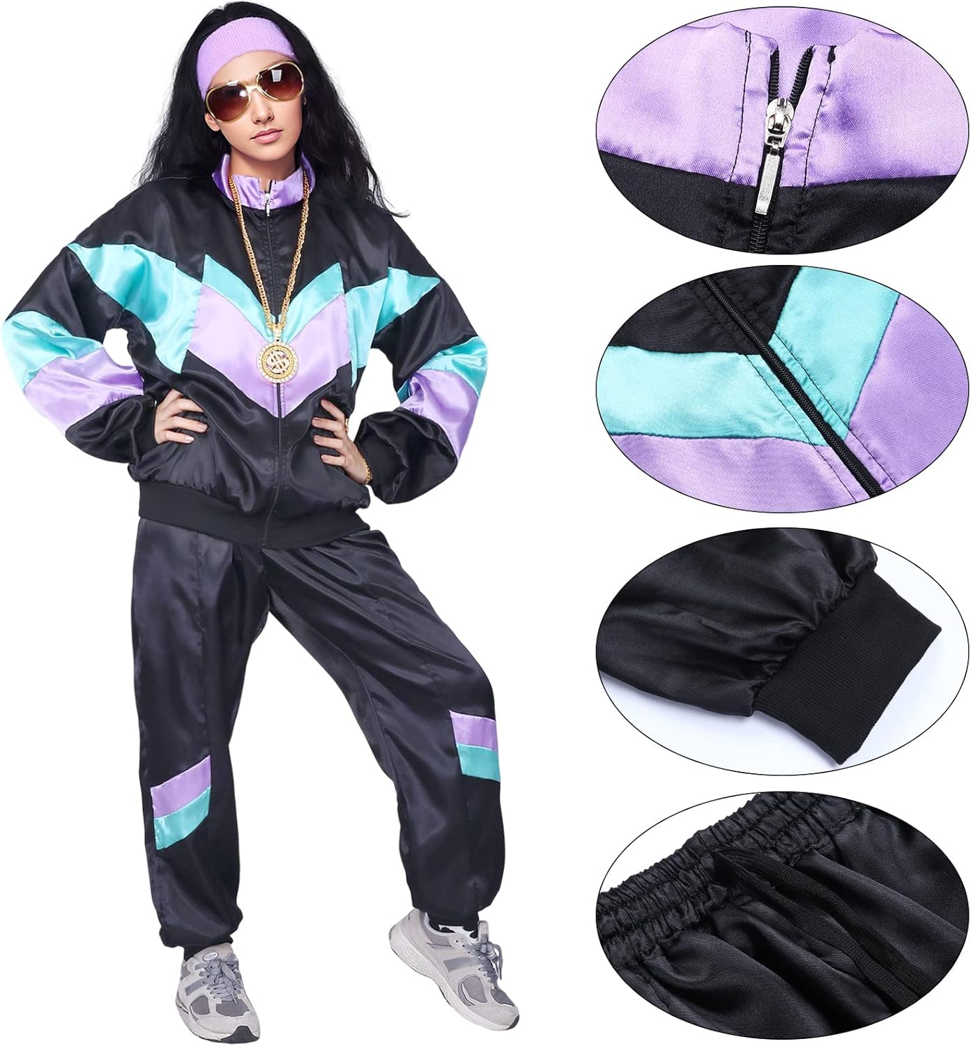 Unique and Careful Design: The fabric of the 80s hip hop costume is made of bright colors, and the simple jacket design has no other prints, which is in line with the design of the 80s. The "S" of the accessories can be rotated, which looks even cooler.