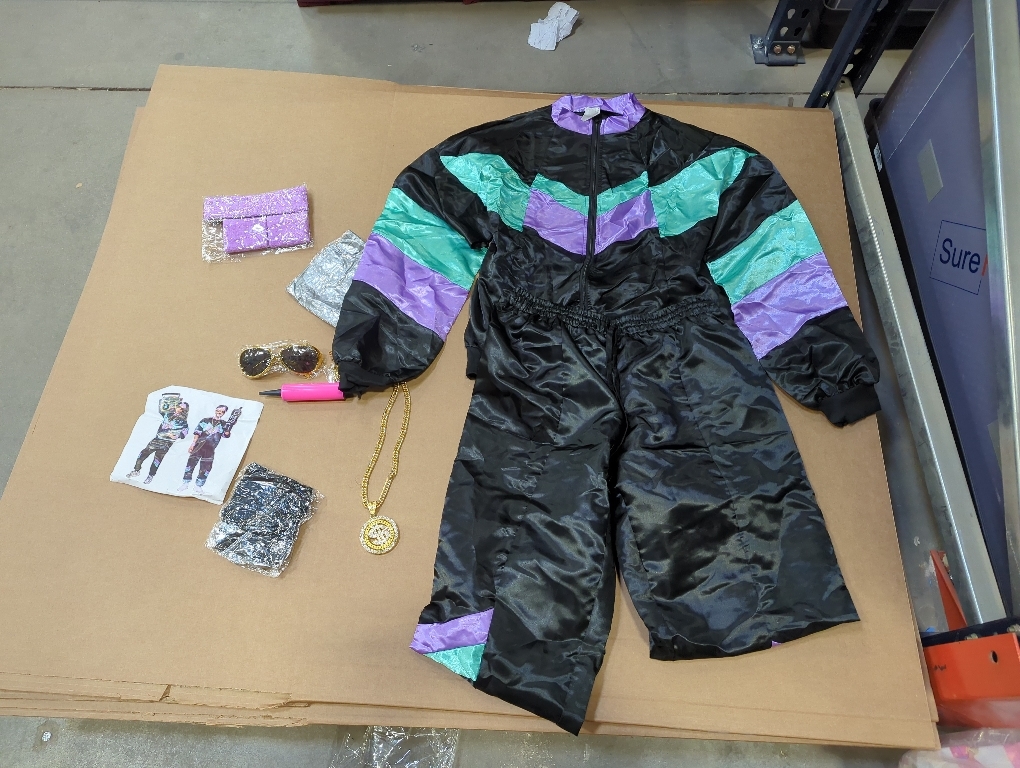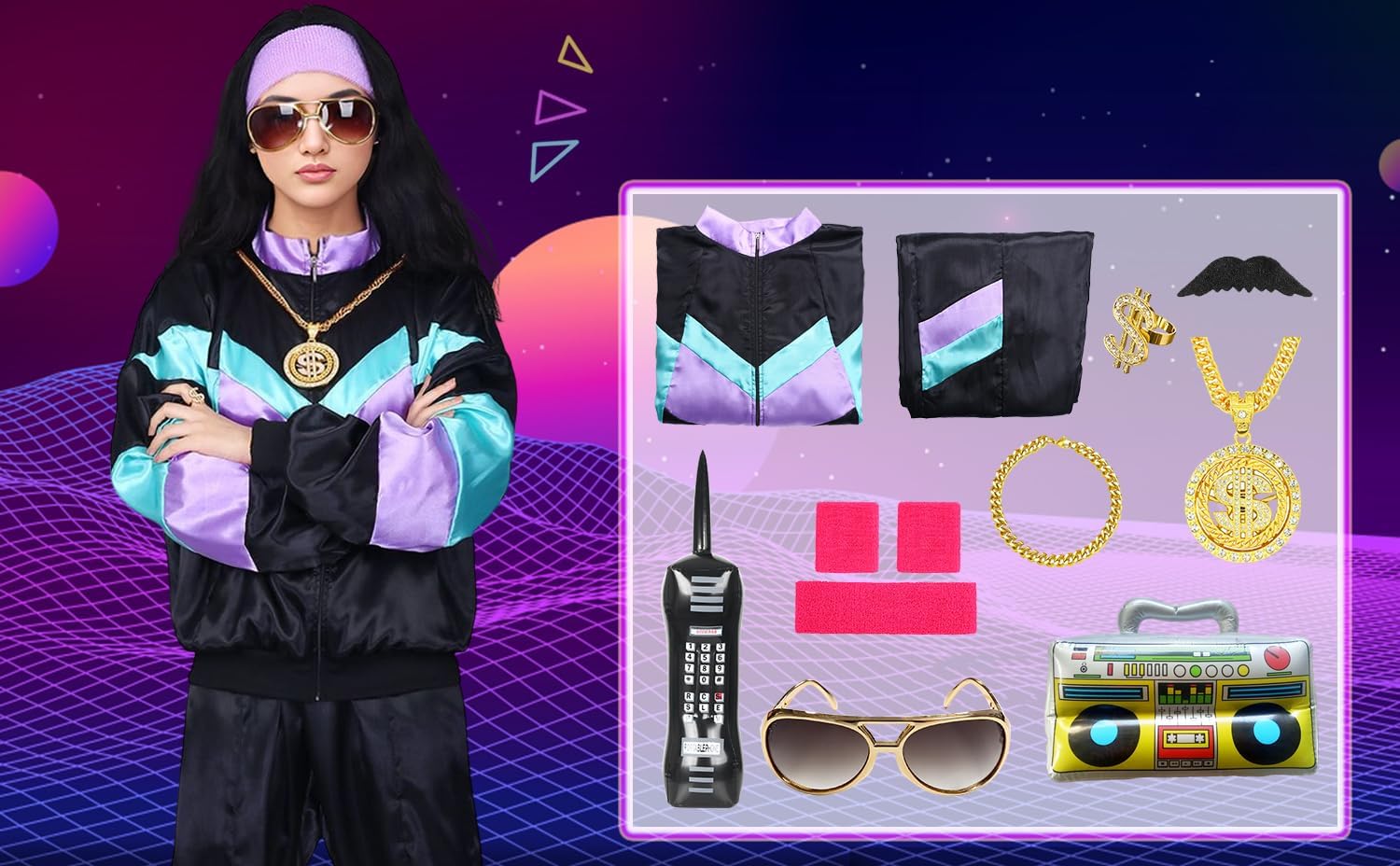 80s Sportswear Set: Includes 1 set of Unisex Tracksuit, 1 Sweatbands Headband, 2 Wristbands, 1 pair of Glasses, 1 inflatable mobile phone, 1 inflatable radio, 3 accessories, 1 fake mustache. Adequate accessories can meet your different needs. A complete costume set allows you to have fun at the party!