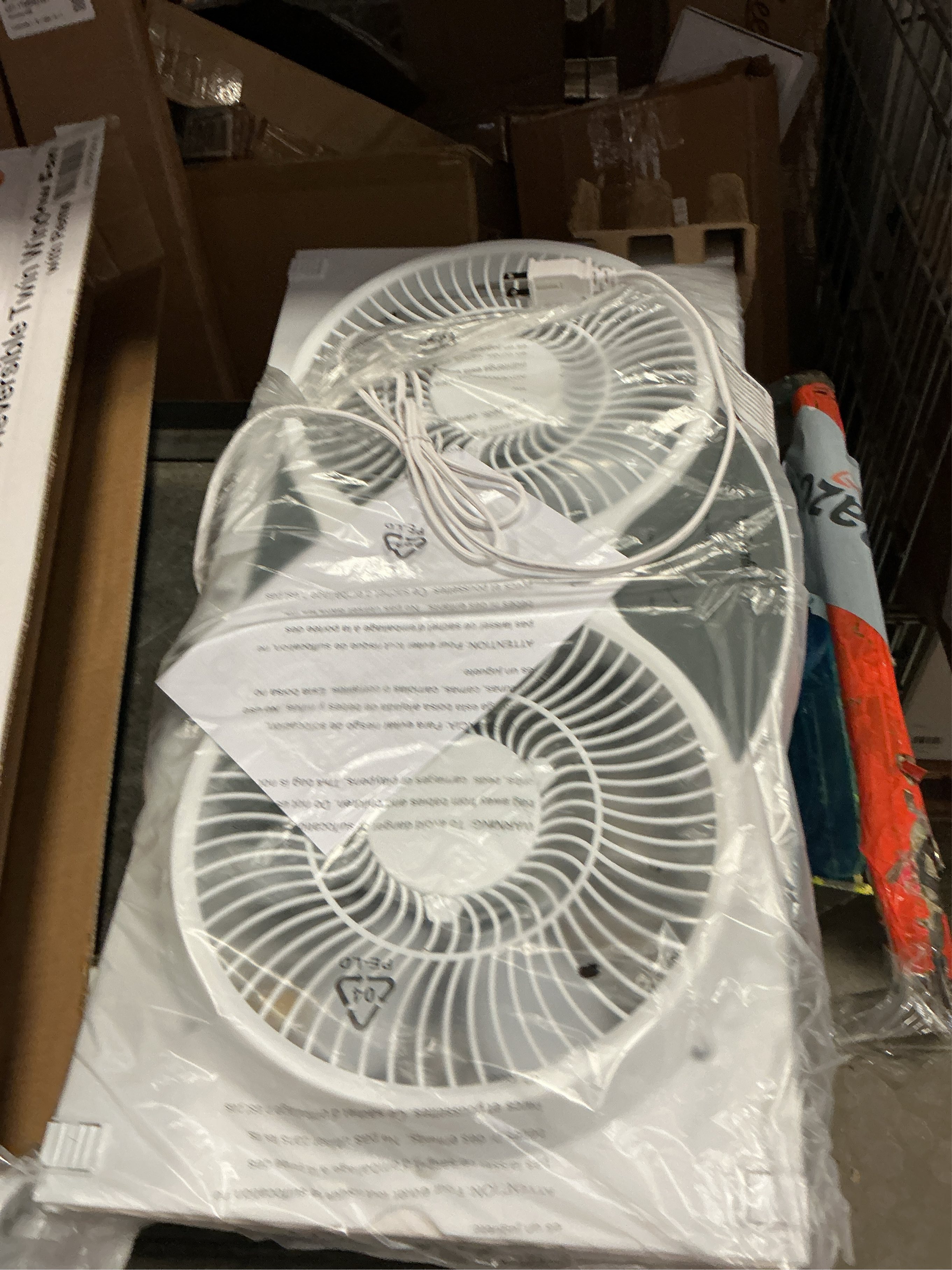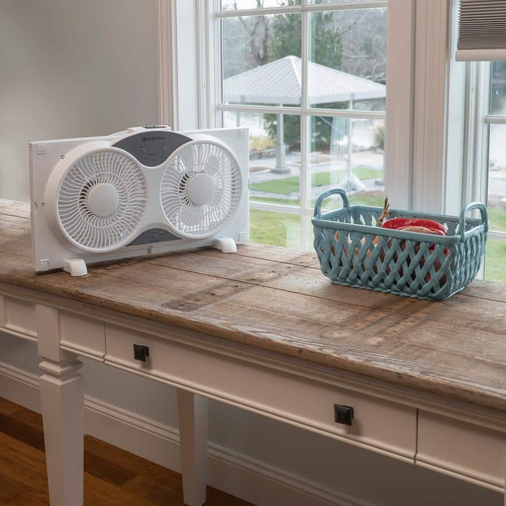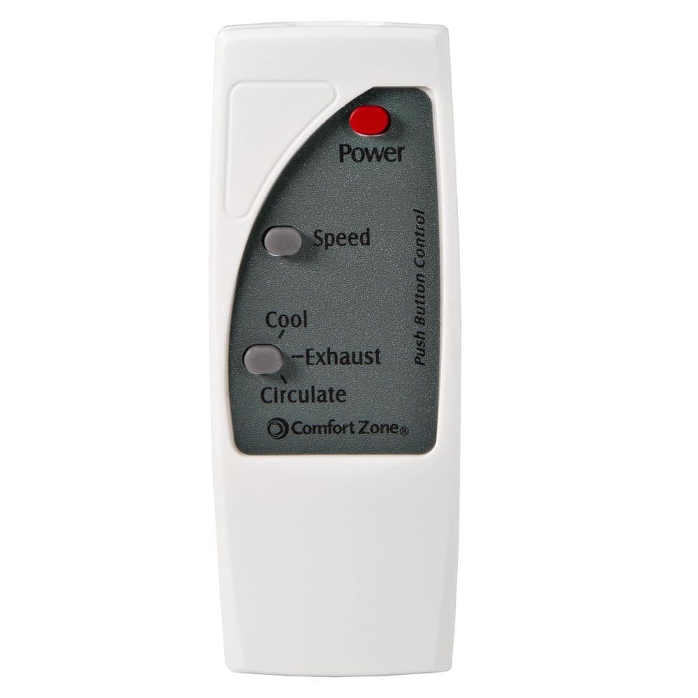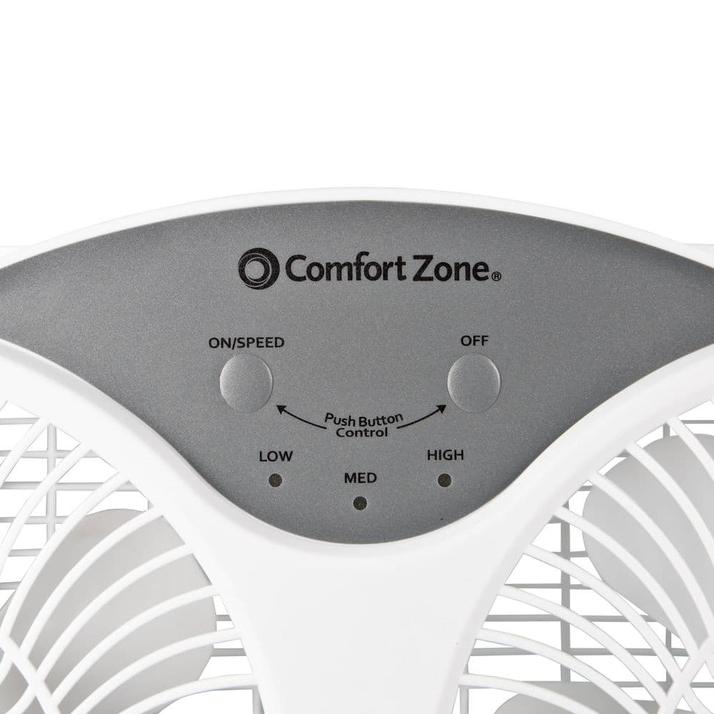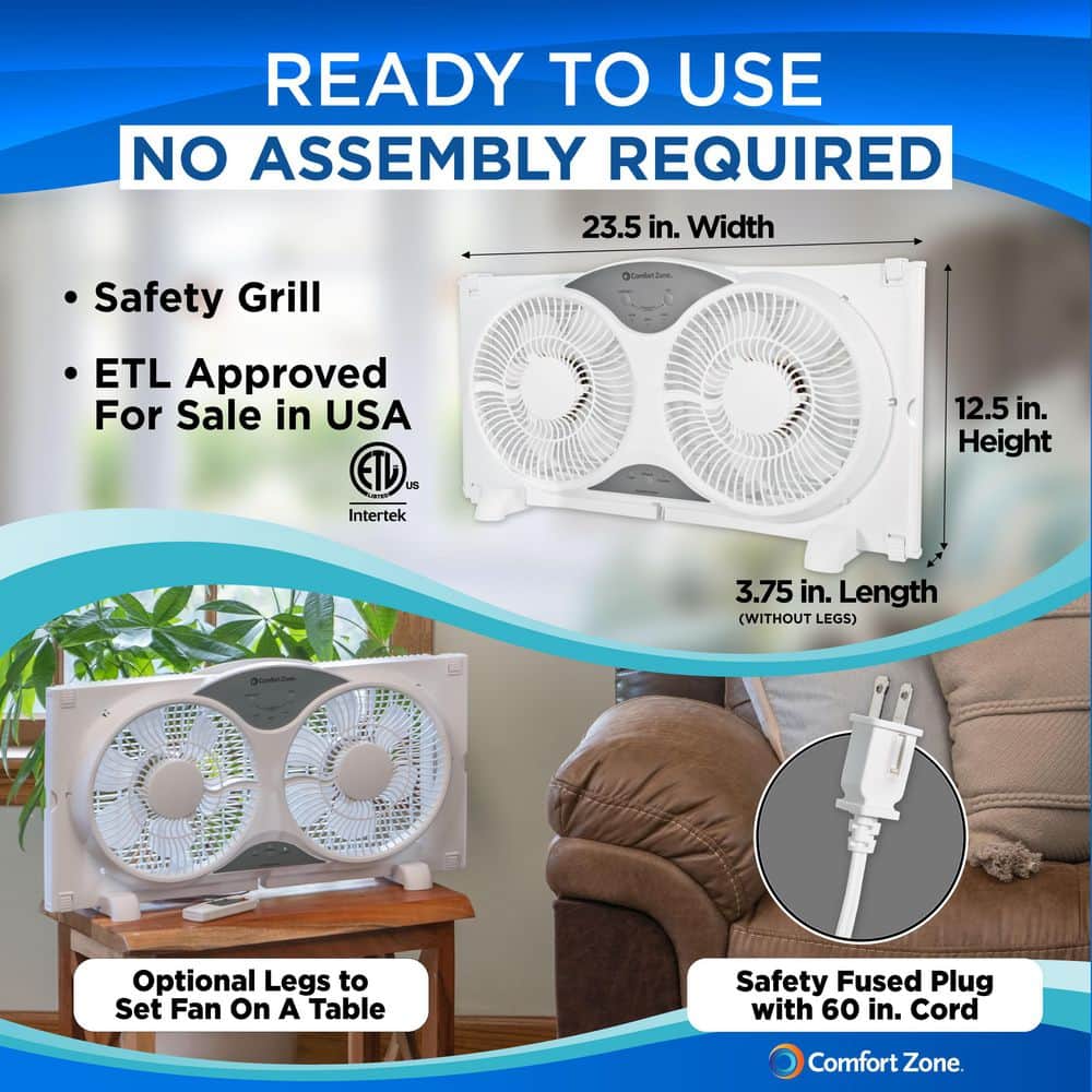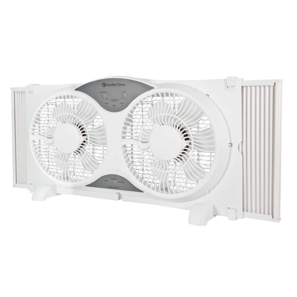 This Comfort Zone Reversible Twin Window Fan with Remote Control has a 3-in-1 design that allows you to choose from three different settings. The cooling setting brings in fresh air, while the exhaust setting removes stale air. The circulation option causes the blades on the dual fans to move in opposite directions for improved air distribution throughout your room. Three fan speed options help keep air moving at the volume you need to keep your space cool and comfortable. Select from low-, medium- or high-velocity output for efficient air circulation that suits any environment. The reversible twin window fan with remote features accordion expanders that can be extended from 23-1/2 in. to 37 in. to adjust to the size of your window. Once the fan is in place, the expanders can be locked to secure it within the window frame. The fan also includes feet which can be attached for using the fan on a tabletop. Using the included remote control, you can select the different fan speeds, choose from the different functions, or power the Comfort Zone reversible twin window fan on and off at the touch of a button, no matter where you are in the room. The reversible twin window fan comes complete with a removable screen to keep bugs out and a removable cover that offers protection and coverage when the fan is not being used.. 3-speed functionality: choose between low-, medium- or high-volume air speed options on this twin window fan in order to optimize air circulation and airflow to suit any environment.. Multi-function options: select the cooling function to refresh a room, the exhaust function to remove stale air or the circulating function to move the blades on each fan in opposing directions. Adjustable width: accordion expanders adjust from 23-1/2 in. to 37 in. to accommodate most window sizes, then can be locked to secure the twin window fan in place. Convenient control: the included remote control allows you to conveniently change speed settings, choose fan functions and power on the fan from a distance. Keep bugs out: the removable screen prevents bugs and debris from getting in through the fan blades and the removable cover protects the fan when it's not in use. Universal - fits most windows. Portable - carry handle and removable legs. Removable feet for tabletop use. Includes a remote control. Fits most windows. Click here for more information on Electronic Recycling Programs. Fan diameter (in.): 9 in. Fan Diameter (in.): 5-10. Height (in.): 13.75 in. Power Type: Plug-In. Number of Window Fans: Dual Fan. Fan Features: Remote Control. Window Type: Single Hung. Number of Fan Speeds: 1-3 Speeds
