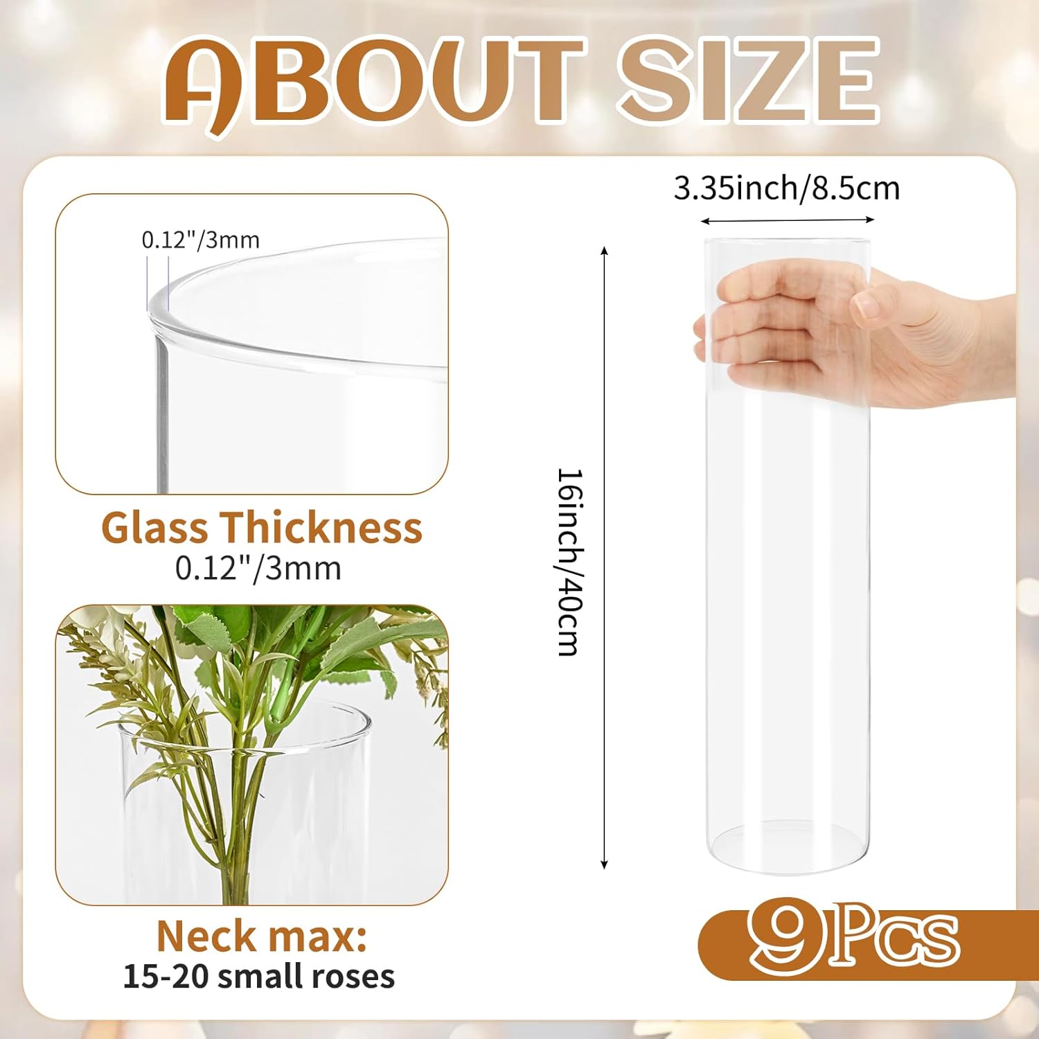 9 Pack Glass Cylinder Vases 16 Inch Tall Clear Flower Vases for Centerpieces, Hurricane Floating Candle Holder Wedding Decorations, Floral Simple Vase Bulk for Party Home Decor (3.35 x 16 Inch)