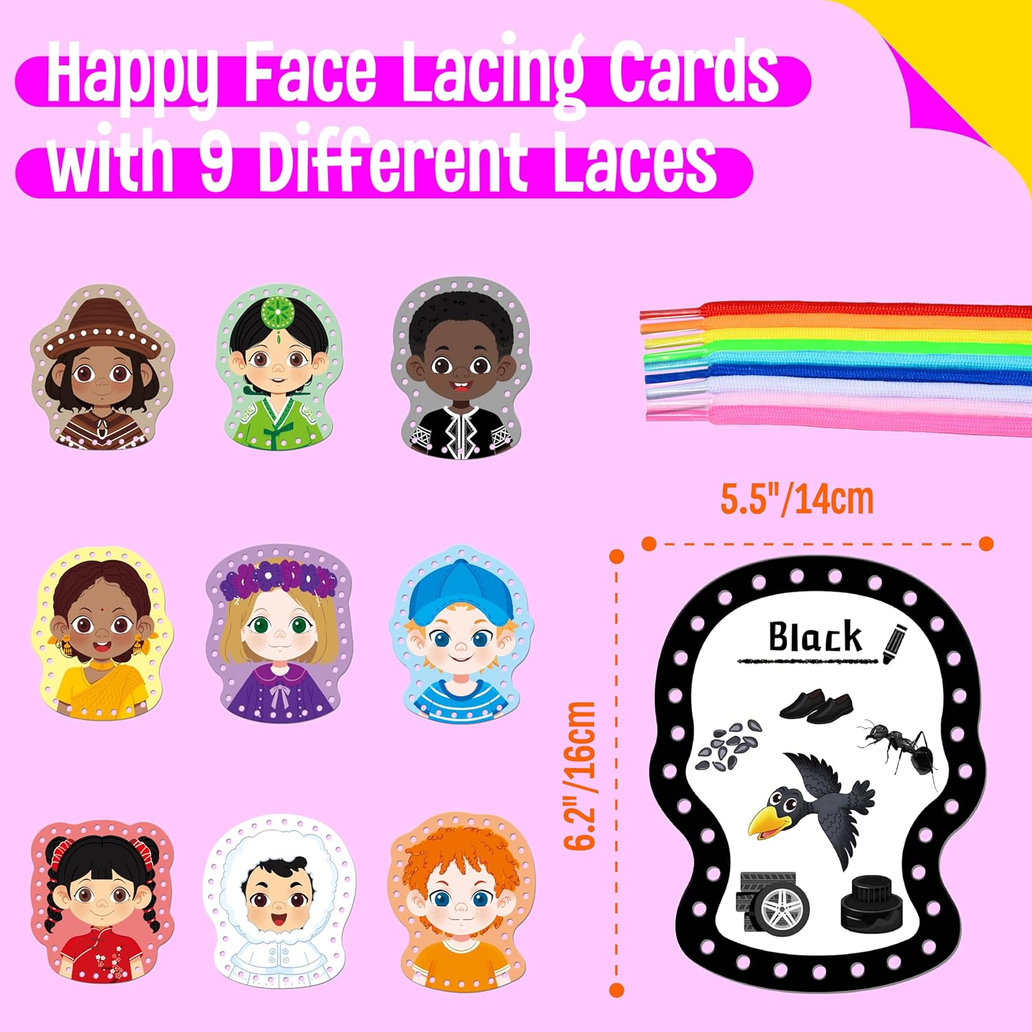 9 Pieces Happy Face Lacing Cards, 9 Double Sided Color Sewing Cards with 9 Colorful Laces, Educational & Learning Activity Games, Imagination Development Lacing Toys for Preschoolers, Kids