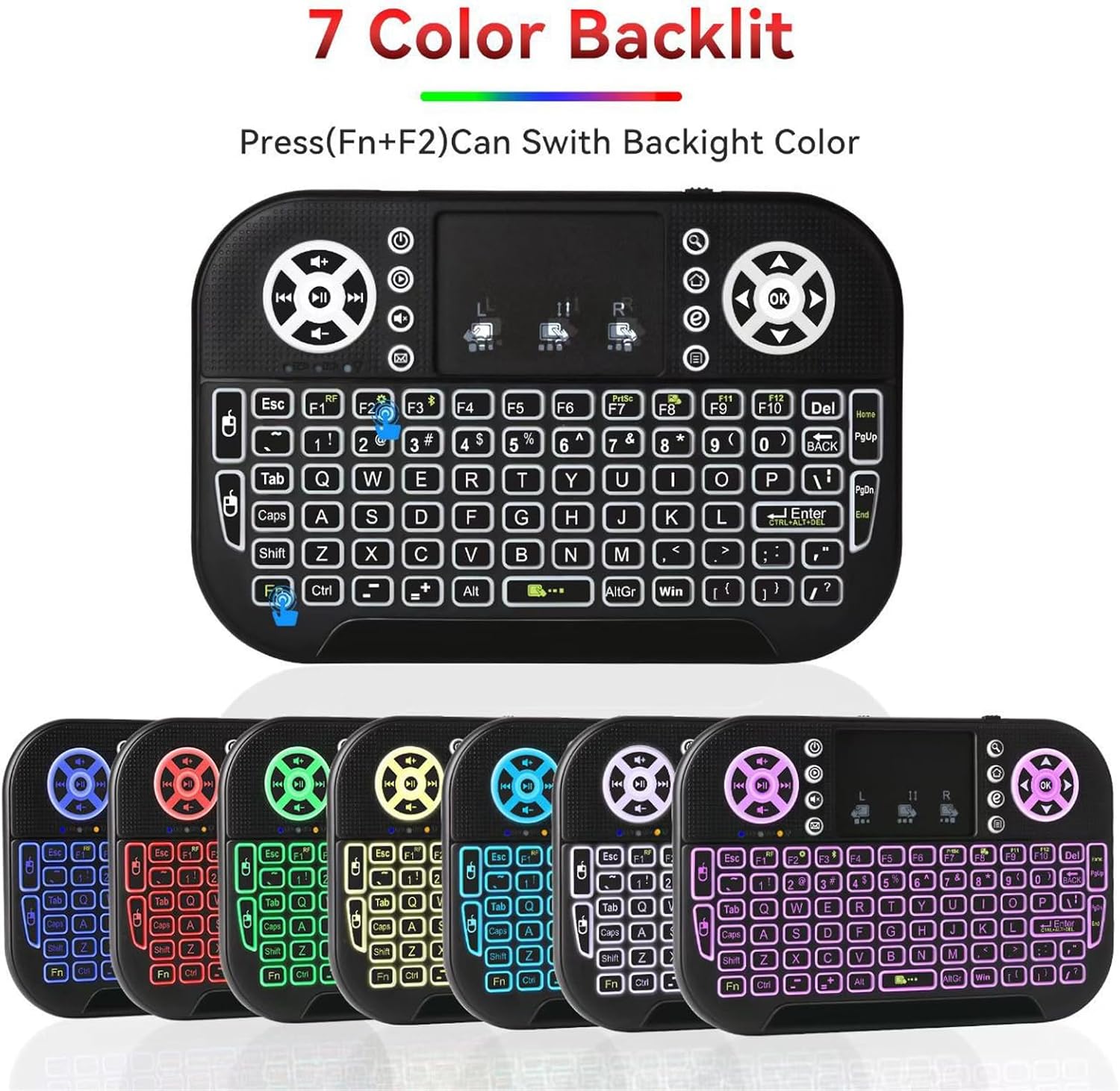 【3 or 7 kinds of Color for backlit】There are three kinds of color you can use for this keyboard. Click Fn F2 combo to change the color. Or press Fn and use your finger slide from L to R on the mouse pad, you can get 7 kinds of color for your choice. Imagine when you use this keyboard at night and it is shinning when you are using it, it creates cool and fancy atmosphere for your work or entertainment.
