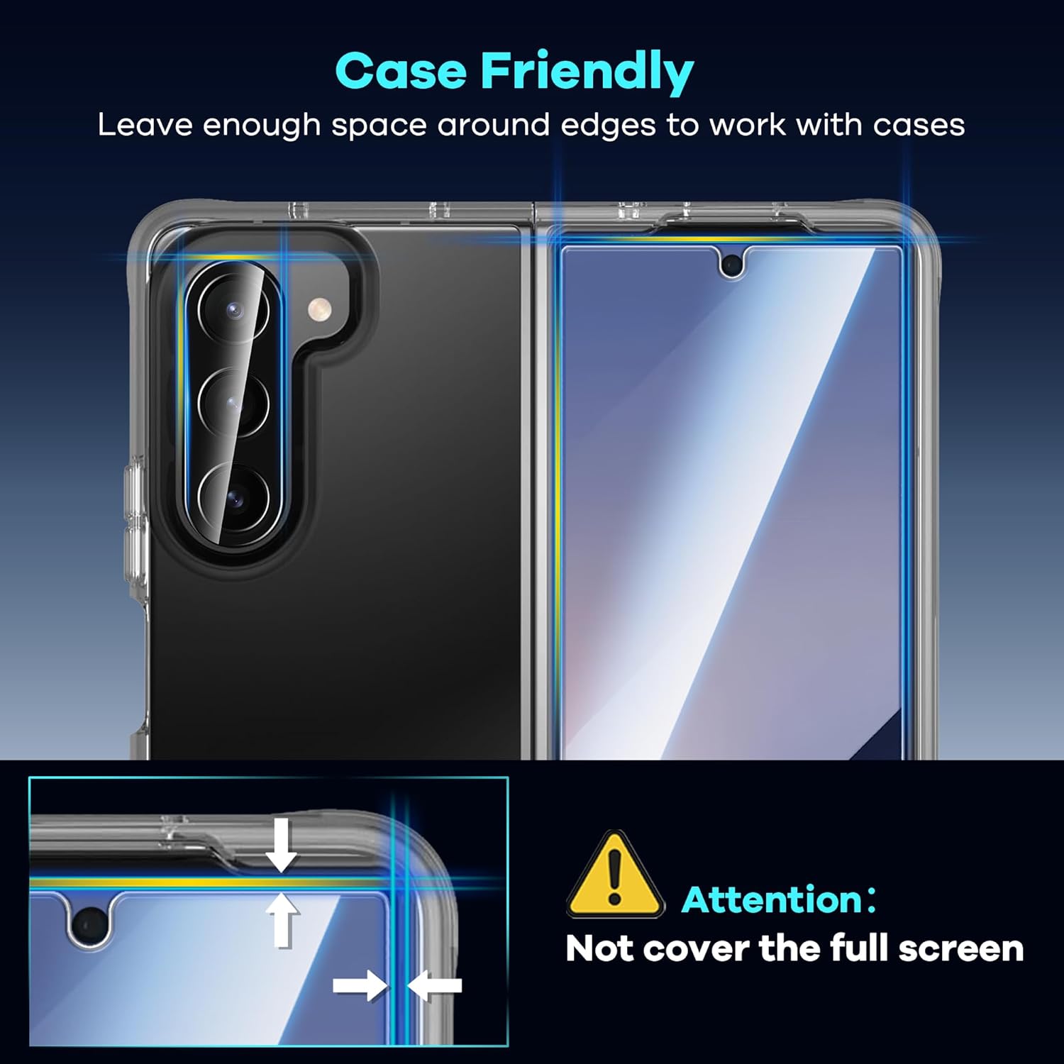 【Case Friendly】The Front screen glass protector is a little smaller than the actual size of the front screen to ensure enough room for your favorite and various styles of cases. Please don't purchase if you mind the front screen protector DON'T cover the entire front screen.
