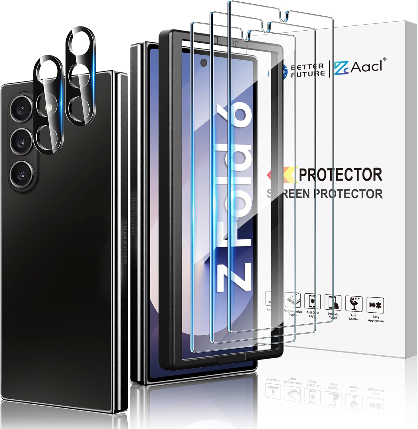 【Package Includes】3-pack front tempered glass screen protector, 2-pack glass camera lens protectors, 1 installation guide, 1 Installation frame, and cleaning kits.
