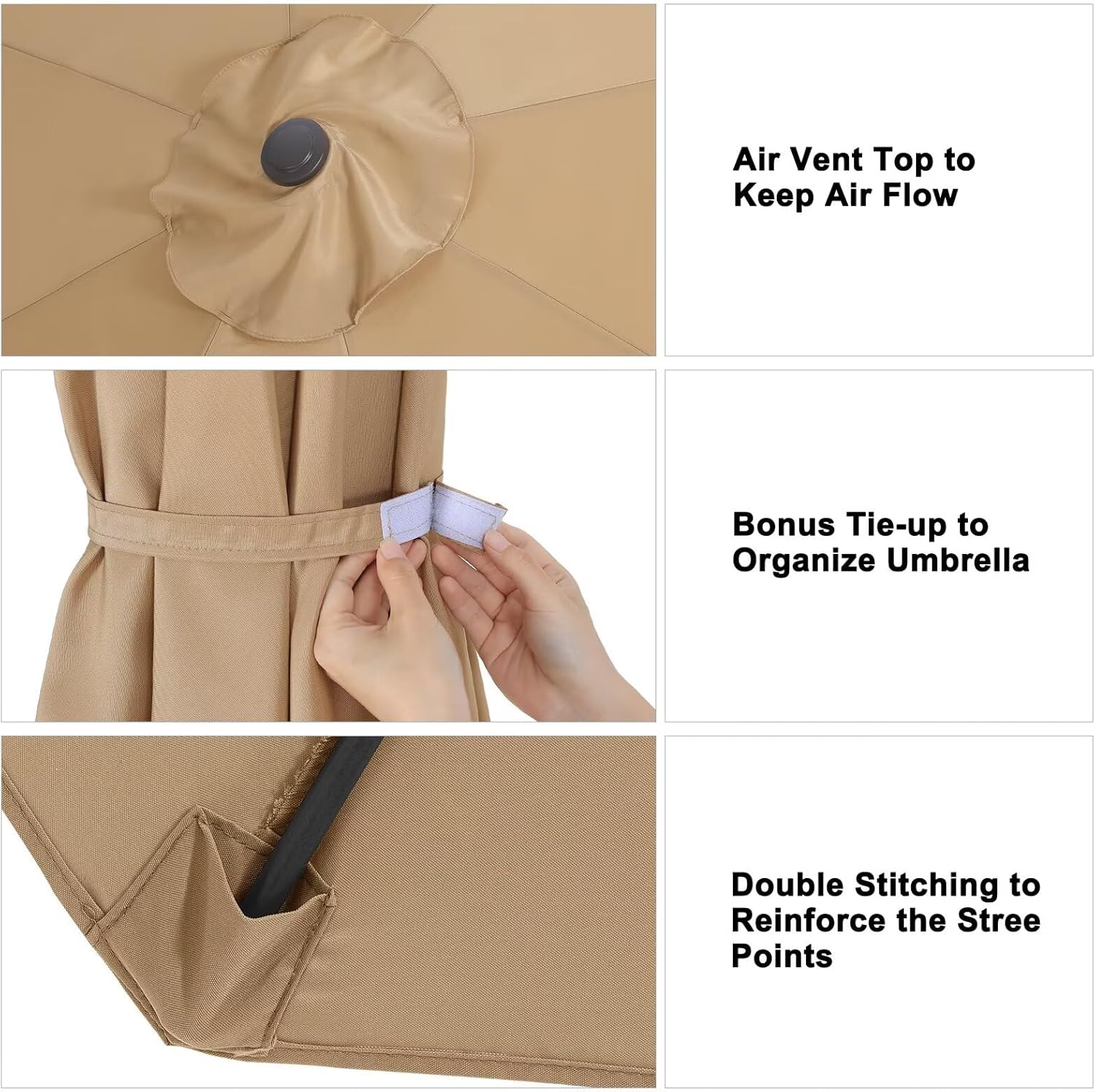 Reenforced stress points where umbrella poles meet canopy. Added strap closure for easy storage.