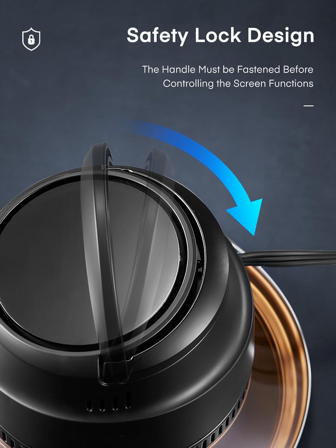 【Protection with Safety Lock Design】 The clever design of the safety latch at the handle can prevent burns or desktop damage if you pick up the air fryer lid but forget to close it during cooking. It is very important that the handle must be tightly fastened before making the air fryer lid operate normally.