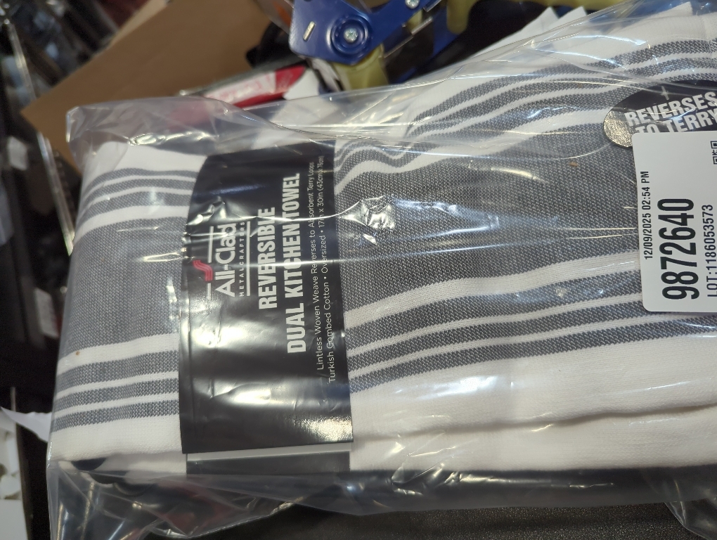 Crafted from 100% cotton, our All-Clad Dual Purpose Kitchen Towels offer superior absorbency and durability, making them ideal for tackling spills, drying dishes, and wiping countertops with ease. The lint less, flat-weave cotton side perfect for drying dishes and glassware while the soft and plush terry-weave side ensures gentle handling of delicate surfaces. Their sturdy woven cotton construction ensures long-lasting use in your kitchen.