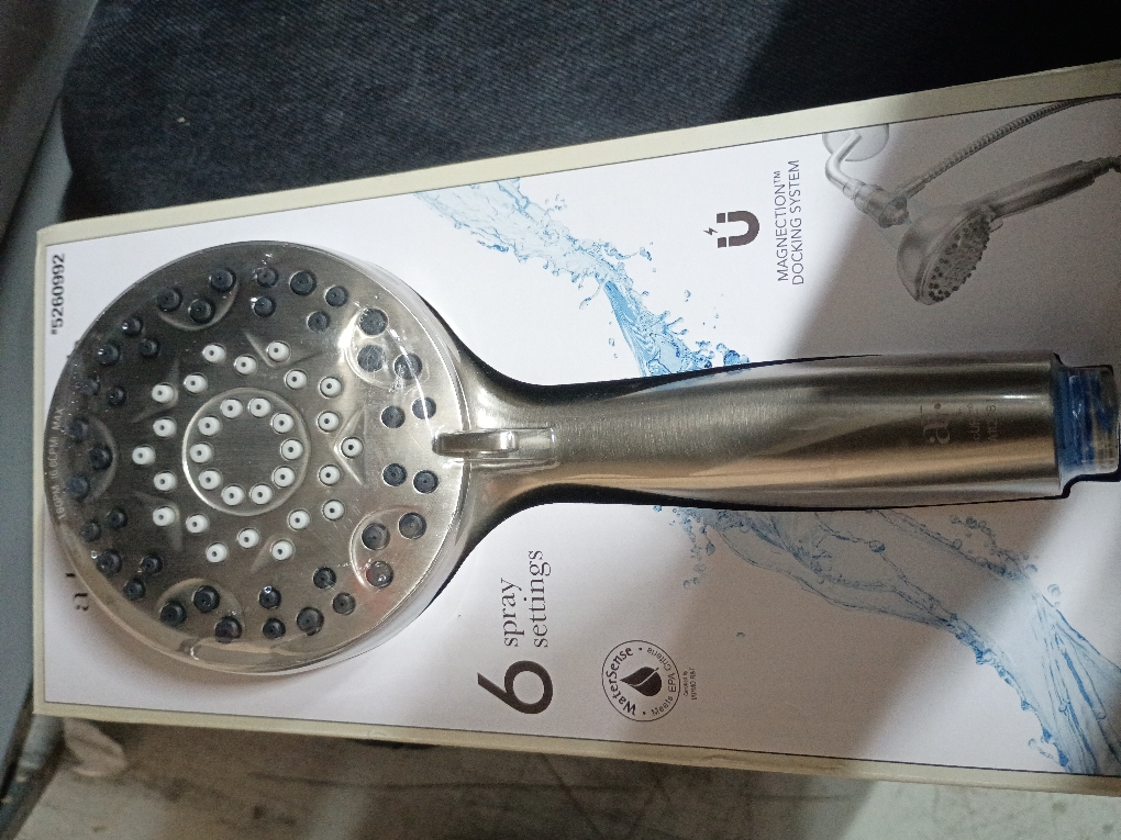 Allen Roth 6-setting handheld showerhead with lock release magnetic docking – brushed nickel finish enjoy the convenience and safety of the lock release magnetic docking feature on this brushed nickel 6-setting handheld showerhead from Allen Roth. The guided magnetic docking system makes it easy to attach the handheld showerhead to the shower arm to provide a secure fit. The lock release technology provides a secure connection and controlled removal when taking the handheld out of the shower bracket. Accidentally knocking the handheld showerhead out of the bracket will be a thing of the past. Six spray functions offer multiple high performance water settings. Conserve water without sacrificing performance with the 1.8 gallon per minute flow rate. A kink-free hose delivers an extended reach, while the nozzles are easy to rub clean. This Allen Roth magnetic showerhead with lock and release docking will help make your shower experience feel like a trip to the spa.