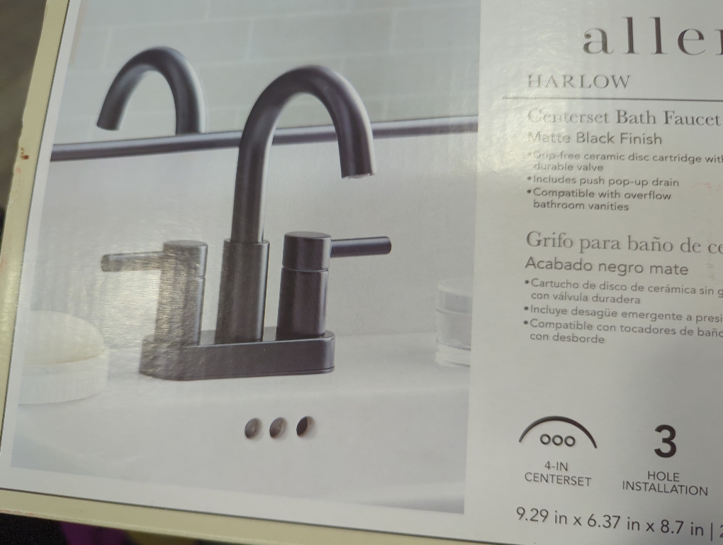 Complete the look of any bathroom with the classic allen roth Harlow 4-in centerset 2-handle bathroom sink faucets. The transitional style of this bathroom faucet makes it a perfect fit for any application. Not only is the faucet stylish, but it is finished with a PVD anti-tarnish technology for durability. It includes matching pop-up drain and is compatible with overflow bathroom vanity sinks. Matte Black allen roth 4 inch centerset bathroom sink faucet, with PVD anti-tarnish technology for durability 2-handle operation with High-arc spout Meets WaterSense criteria to conserve water without sacrificing performance, delivering 1.2 GPM flow rate Tested and certified to meet NSF safety requirements Reliable ceramic disc cartridge/valve Includes a matching pop-up drain Compatible with overflow bathroom vanity sinks Backed by allen roth's limited lifetime