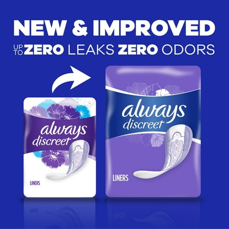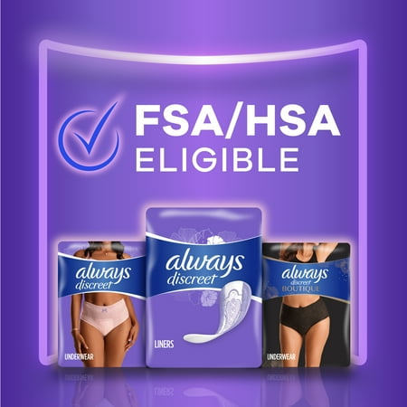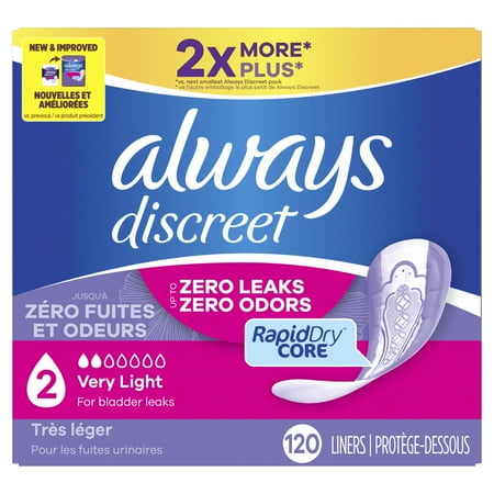 PROTECTION YOU WILL BARELY FEEL that won't hold you back MADE DIFFERENTLY - Hidden RapidDry core turns liquid to gel and locks it away END TO END CORE WITH SIDE LEAKGUARDS to help keep wetness away from the edges LINERS STAY COMFORTABLY IN PLACE and are discreet under your clothing FIND THE RIGHT SIZE PAD OR PANTILINER FOR YOU using the Always Discreet My Fit size chart INCONTINENCE PADS AND PANTILINERS FOR WOMEN ARE FSA AND HAS ELIGIBLE Very Light, 120 Ct