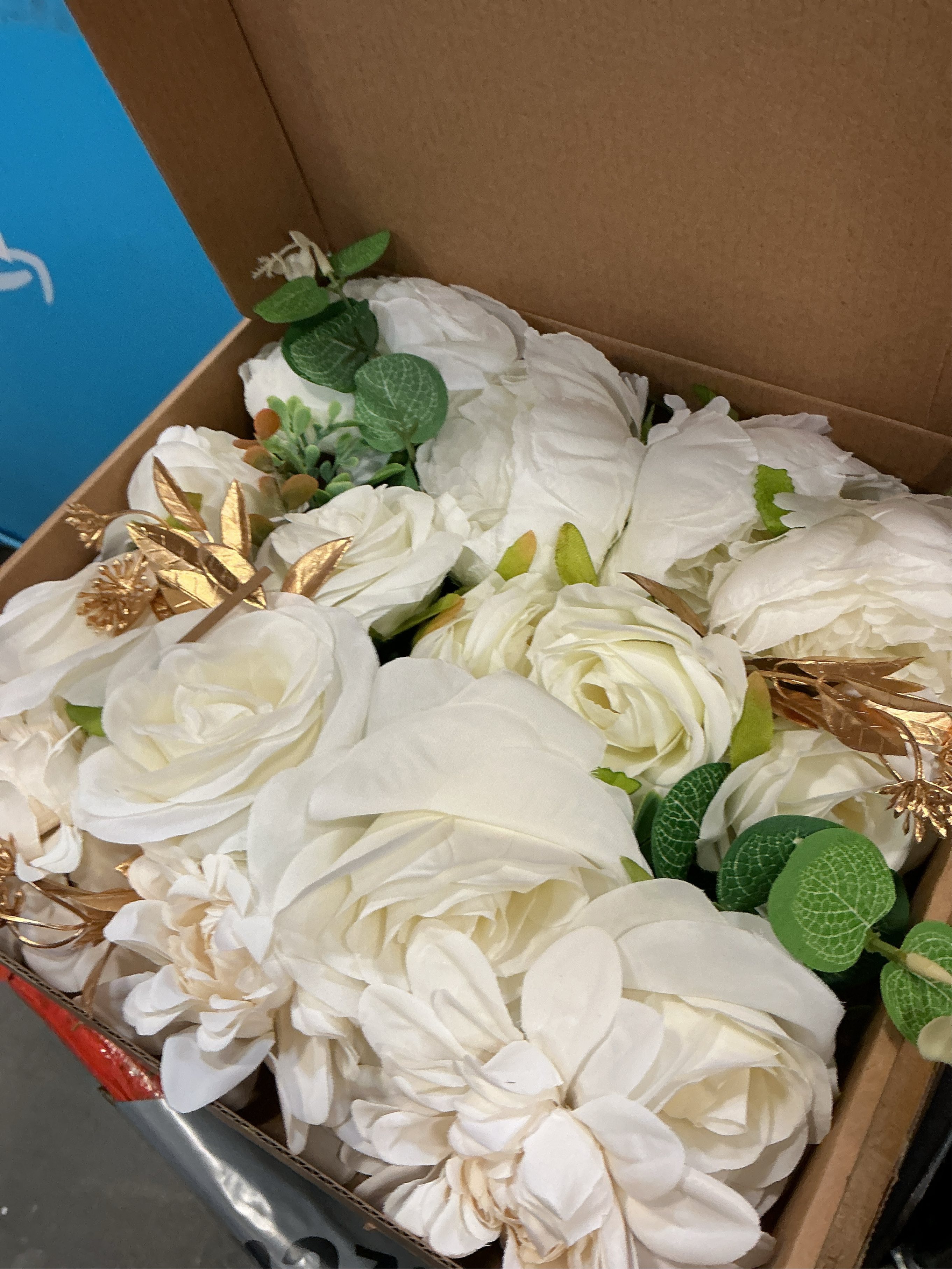 Product Specification:Ivory peony flower x 4pcs;Ivory rose x 4pcs,Light yellow rose x 5pcs;Ivory dahlia x 3pcs;Golden leaves x 3pcs,eucalyptus branch x 3pcs(assorted size and color),milan leaves x 2pcs