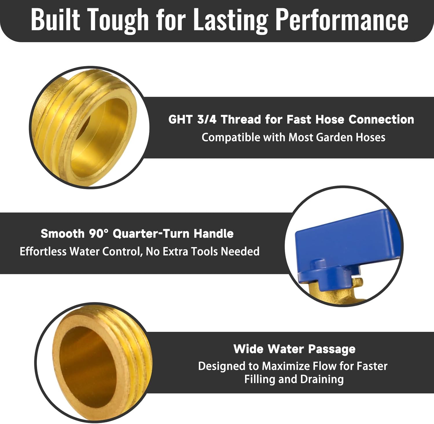Specification: Engineered to work seamlessly with all standard GHT 3/4 garden products, the water spigot with bulkhead fitting fits most garden hoses and buckets, providing a tight connection for rainwater collection systems