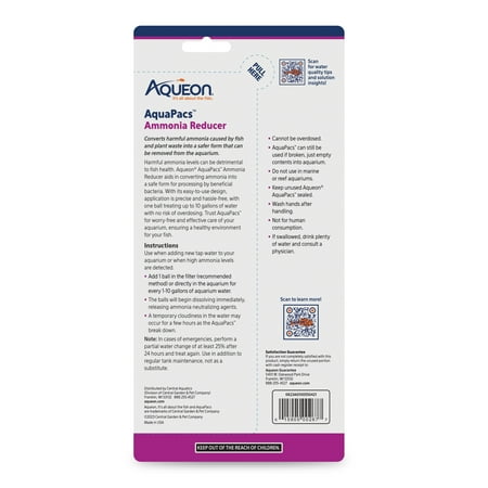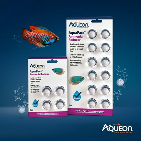 EASY-TO-USE DESIGN makes applications precise and hassle-free. One ball treats up to 10 gallons of water with no risk of overdosing. NEUTRALIZES HARMFUL AMMONIA levels in all aquariums. Aids in converting ammonia into a safe form for processing by beneficial bacteria. STARTS WORKING IMMEDIATELY. AquaPacs Products dissolve immediately, releasing agents that address chlorine, ammonia, sludge and debris. DEVELOPED BY AQUATIC HOBBYISTS AND EXPERTS, Aqueon provides a broad array of aquarium solutions to help maintain healthy, life-sustaining aquatic environments. AVAILABLE IN FOUR OPTIONS to meet your aquatic needs. Aqueon AquaPacs Ammonia Reducer, Water Clarifier, Water Conditioner and Sludge Remover can be used alone or together for complete aquatic care.