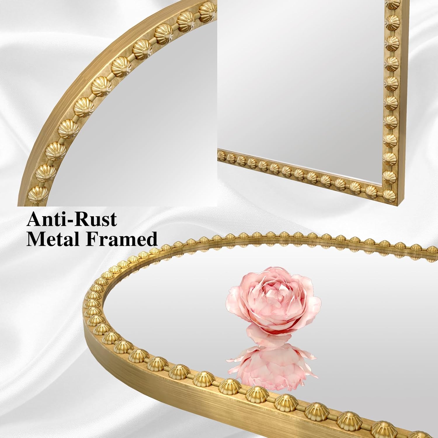 【Elegant Floral Metal Framed Mirror】 The 24x32 inch Gold Arch Bathroom Mirror is made of metal material, a clear reflection with no distortion, clear lines, Floral metal frame design. Different from the other frame designs, elegant and anti-corrosion property, you can hang it easily by yourself.