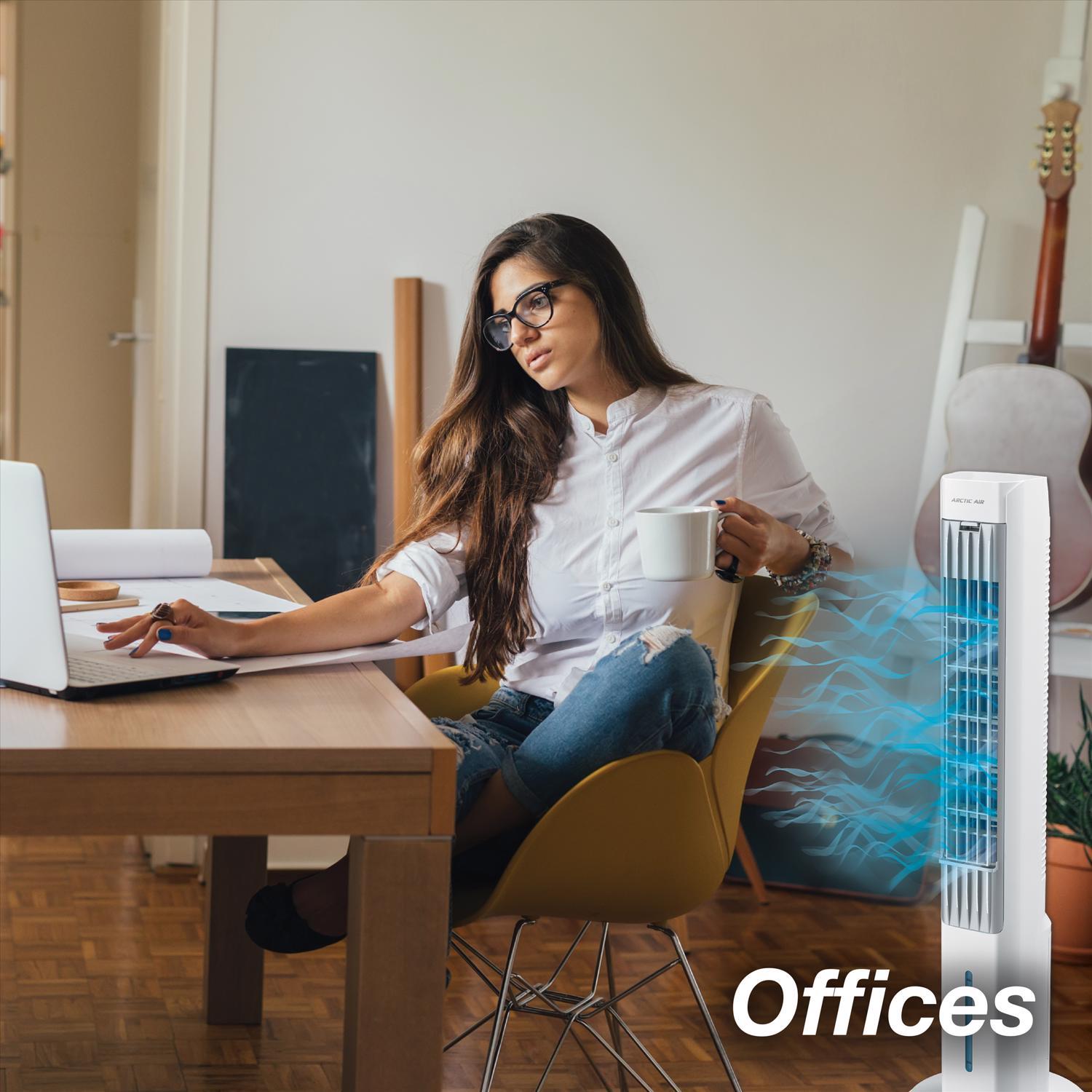 Introducing Arctic Air Tower , the evaporative air-cooling tower. Take your comfort virtually anywhere for larger area cooling Arctic Air Tower helps cool and humidify any space, The secret is the Hydro-Chill technology. Simply fill Arctic Air Tower with water and enjoy cooler, chilled air practically anywhere, This powerful space cooler uses six cooling jets and an evaporative air-cooling cartridge to help turn hot air into cooler, refreshing air instantly, Arctic Air Tower 's space-saving design is lightweight and portable. The convenient carry handle allows you to bring it with you to any room of the house. Itâs great for bedrooms, living rooms, kitchens, offices, basements, and more, Arctic Air Tower oscillates and is perfect for larger area coverage. Arctic Air Tower is quiet, so itâs unlikely to disturb you or others around you. The easy-to-use touch controls adjust the 4-speed settings, LED nightlight, oscillation, and auto-shut-off features. Best of all, Arctic Air Tower can run for up to 16 hours per fill, so you donât have to worry about constantly adding water. Experience the cooling comfort of Arctic Air Tower.