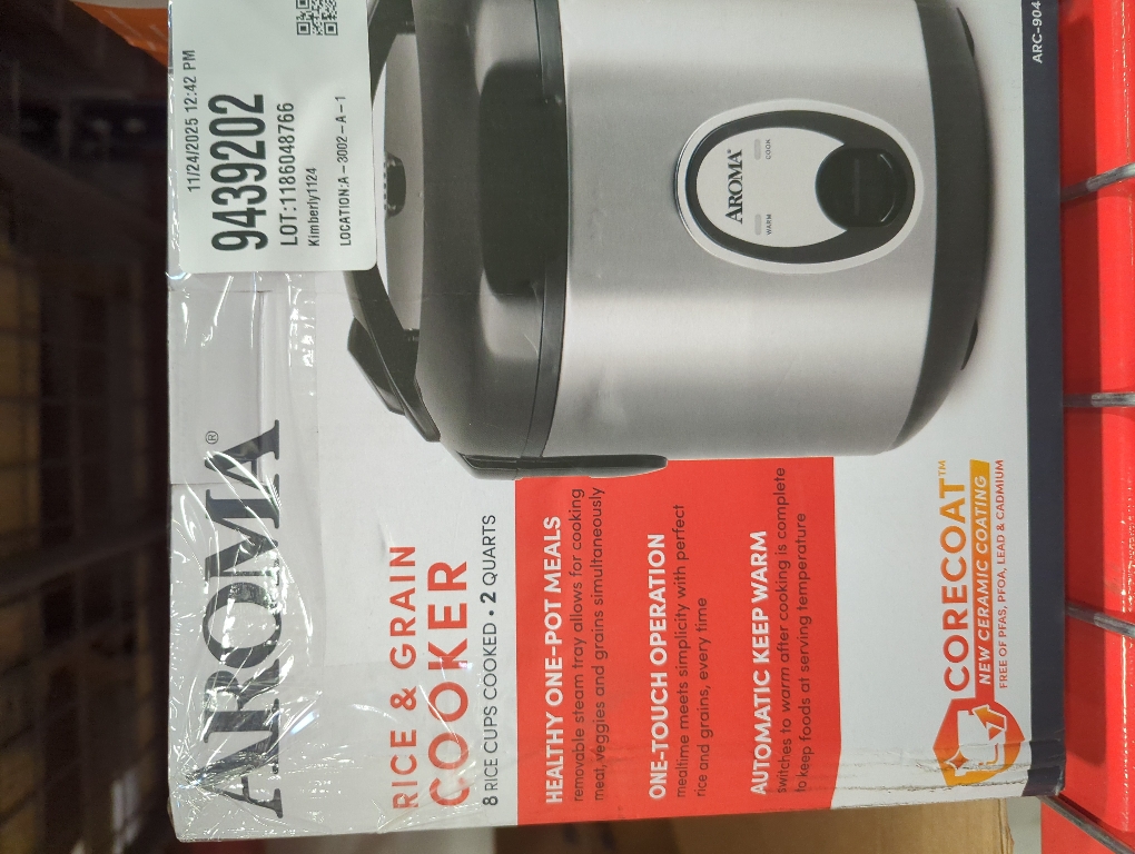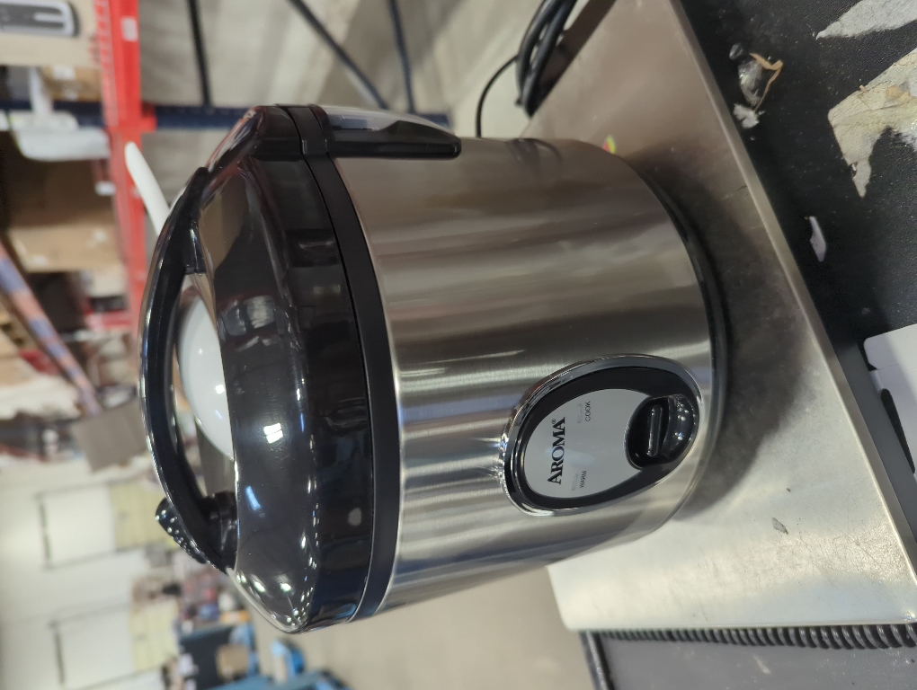 Easily prepare up to 8 cups of cooked rice in this Aroma Rice Cooker. Made of stainless steel with a brushed finish and a cool touch exterior. The cooker has an removable non stick cooking pot and a lid, making cleaning up easy. Includes a steam tray, serving spatula, rice measuring cup and instruction manual. Features a locking lid, keep warm function, condensation collector. Great for rice, chili or soups!