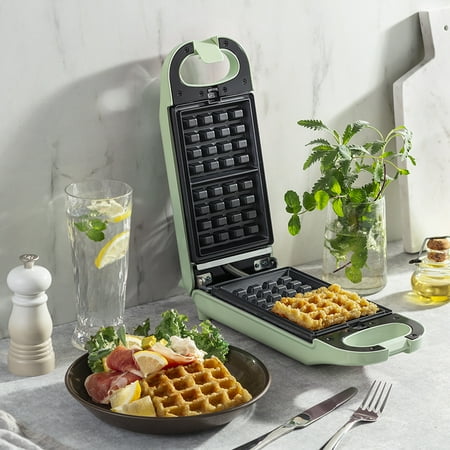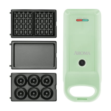 Aroma's Flip and crisp for golden-brown color on both sides Cook 2 waffles, 1 panini, or 6 mini donuts at a single time Swap 3 sets of specialty plates that click into place Clean up faster with elite non-stick surfaces Stand upright to fit in cupboards or store flat in a drawer Condition : New