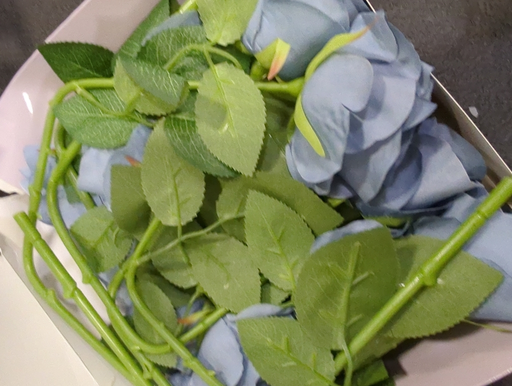Material: rose artificial flowers and leave is made of high quality silk cloth; the stem is made of plastic with metal wire inside it.Our silk rose flower head is navy blue color with green stem and 6 pieces green leaves, the stem can be cut or bend for the size you want, it’s flexible.