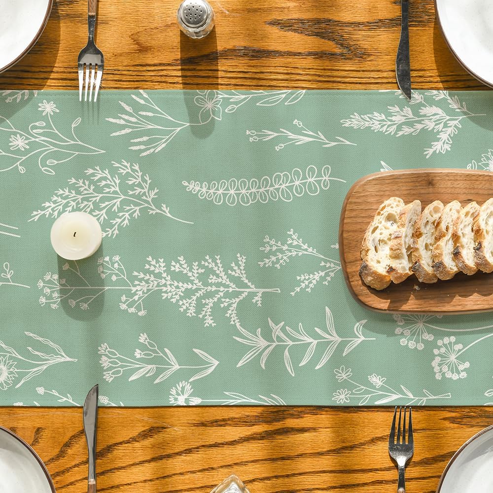 Artoid Mode Sage Green Leaves Flowers Spring Table Runner, Seasonal Kitchen Dining Table Decoration for Home Party Decor 13x72 Inch