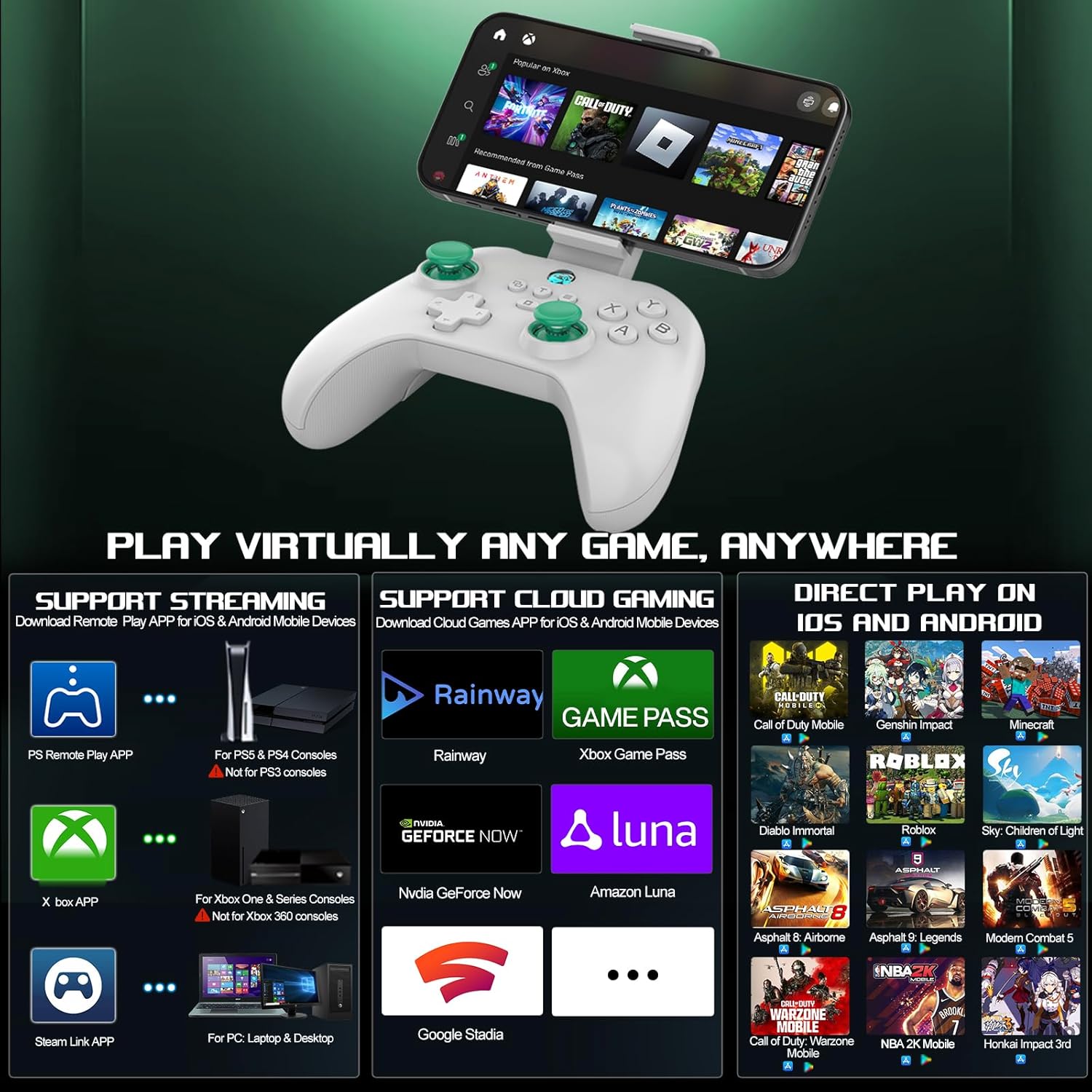 【PLAY ANY CONTROLLER SUPPORTED APP GAMES】arVin android phone controller compatible with most cloud gaming, a pple arcade and mfi games. You can play controller games on Xbox game pass, Nvidia GeForce Now, Amazon Luna, Google Stadia, Rainway and most cloud app. The mobile gaming controller for call of duty mobile(CODM), Call of Duty: Warzone Mobile, Genshin Impact, Sky: Children of Light, Minecraft, Diablo Immortal, Combat Modern 5, Asphalt 9: Legends and Asphalt 8: Airborne etc.