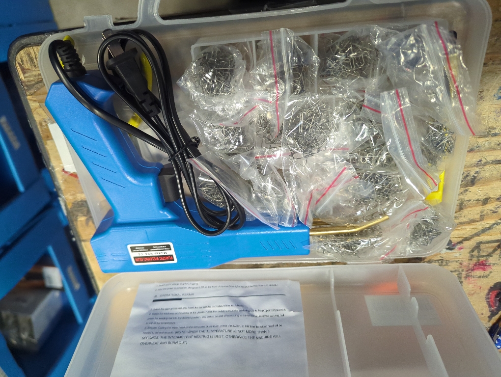 Portable Welder: Plastic Repair Welder Kit, Bumper Kayak Repair Kit will come with plastic welder, pliers, carry case, 150X 0.6mm flat staples, 150X 0.8mm flat staples, 200X 0.6mm wave staples, 300X 0.8mm wave staples, 100X 0.6mm inside corner staples, 100X 0.8mm outside corner staples