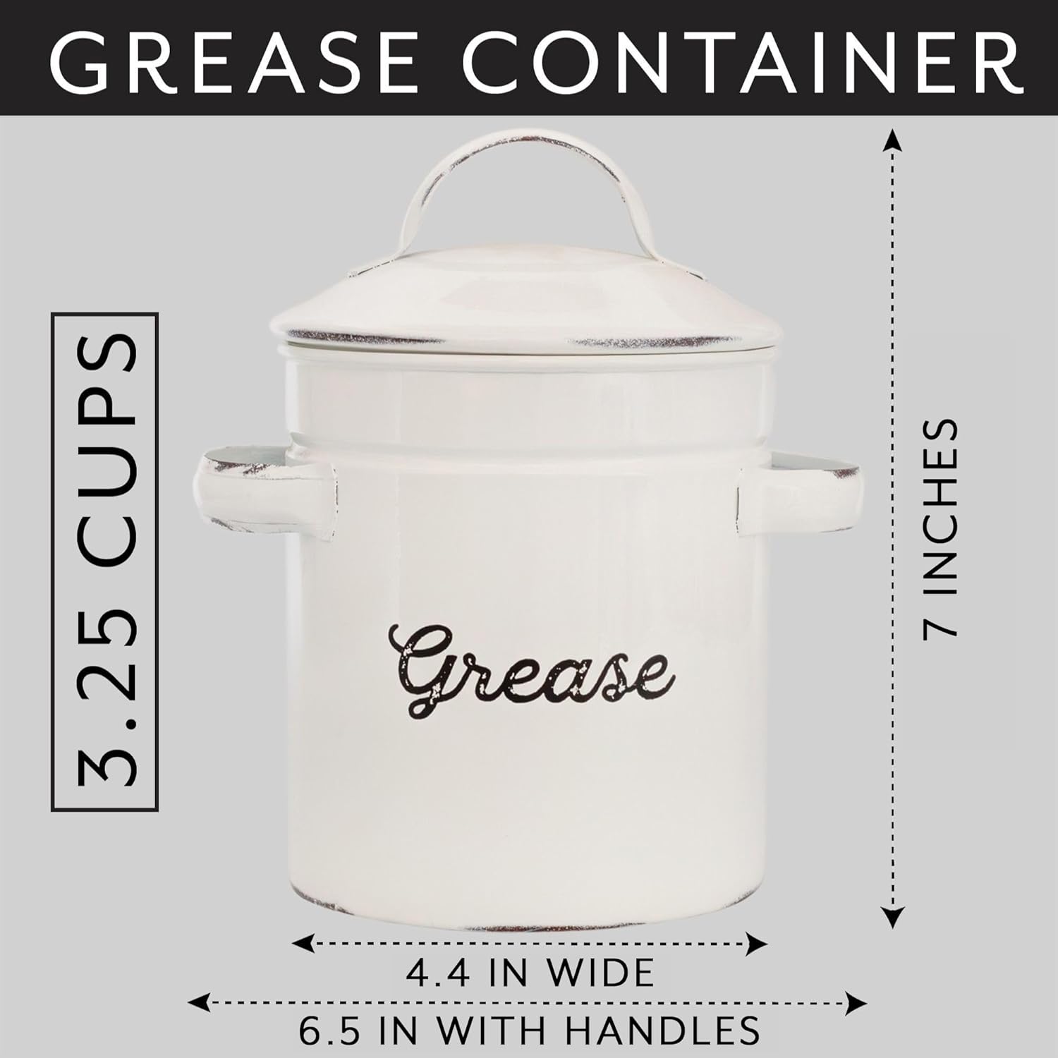 COLOR: Distressed white enamel farmhouse style; SIZE: 6.5 X 4.4 X 7 inches tall; CAPACITY: 3.25 cups