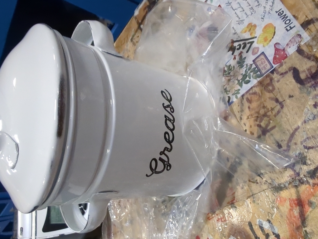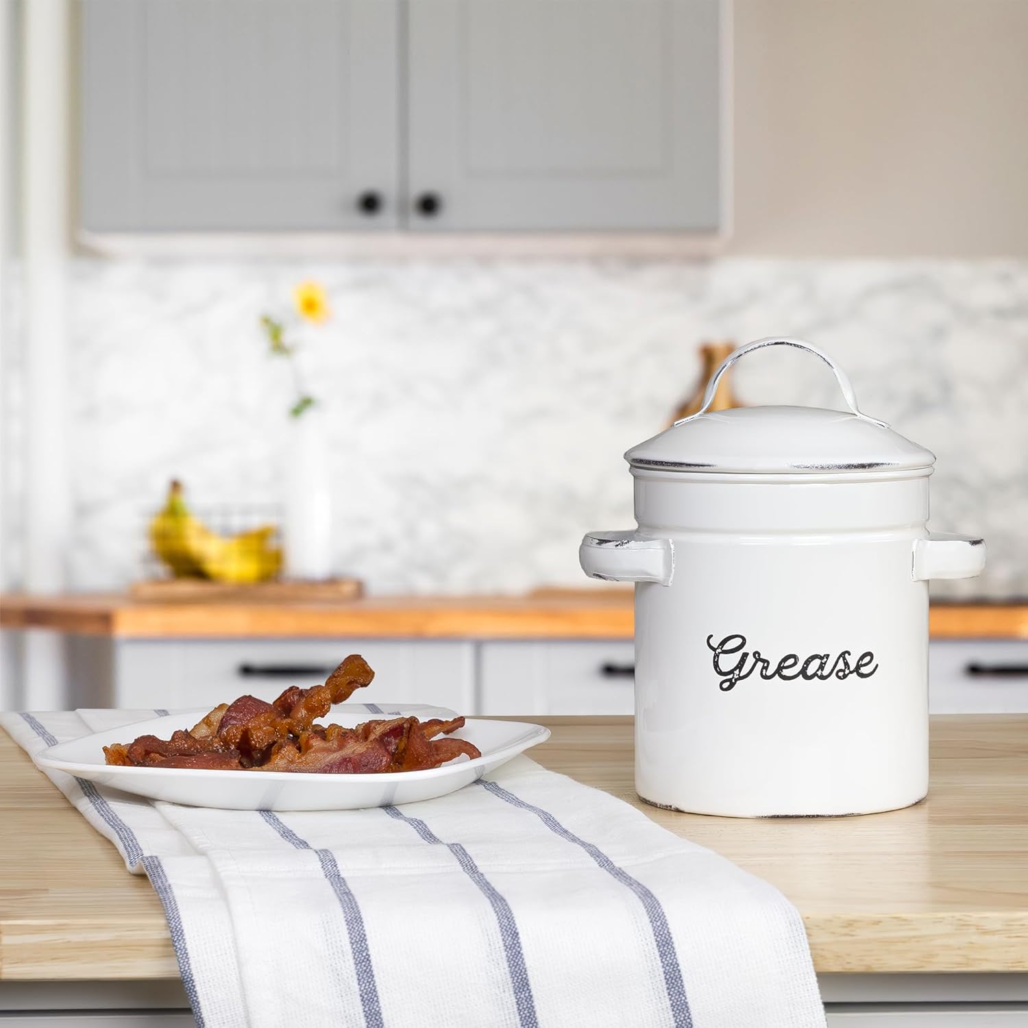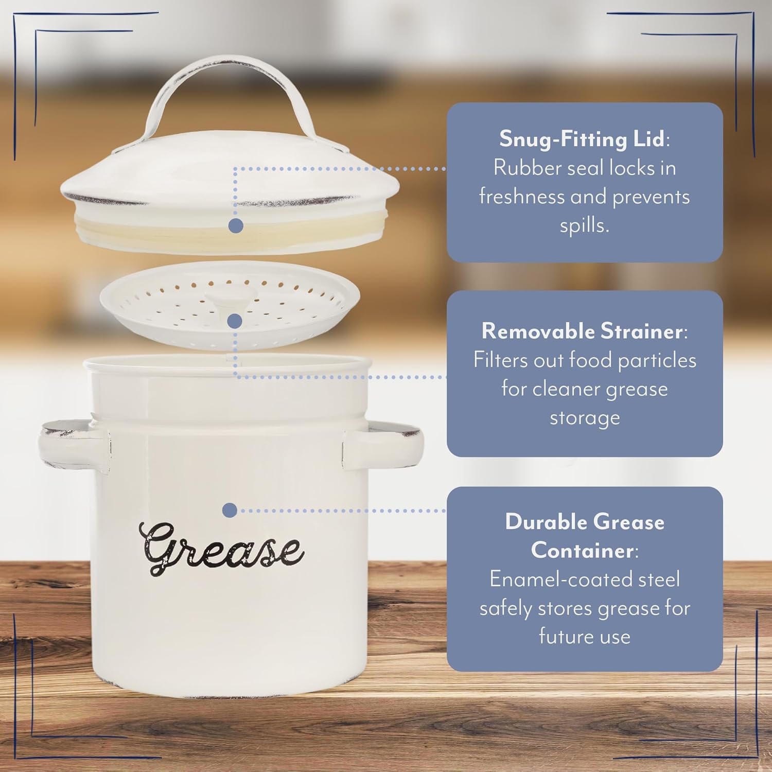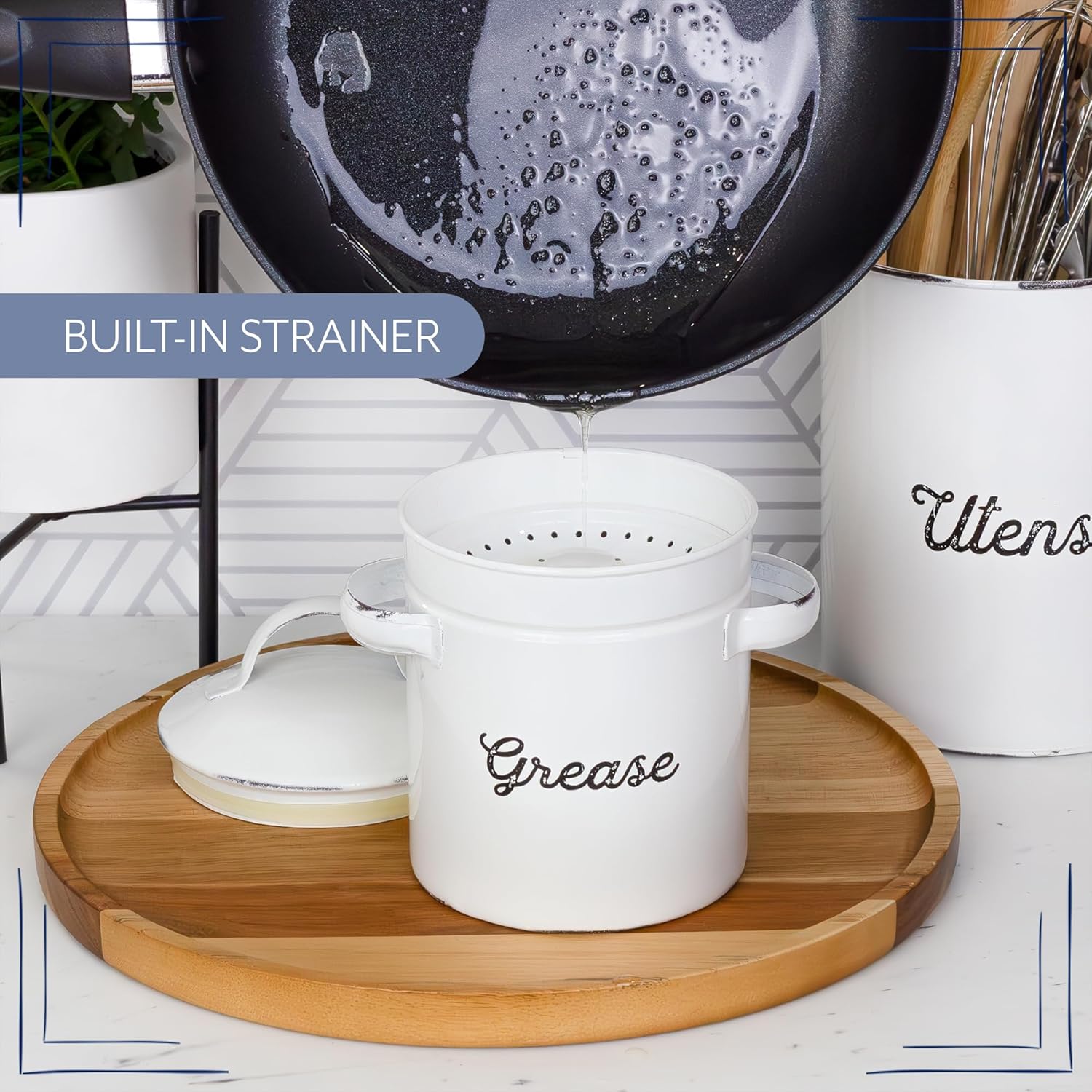 AuldHome Design Enamelware Grease Container w/ Strainer, Farmhouse Style Kitchen StorageTin, Labeled "Grease"
