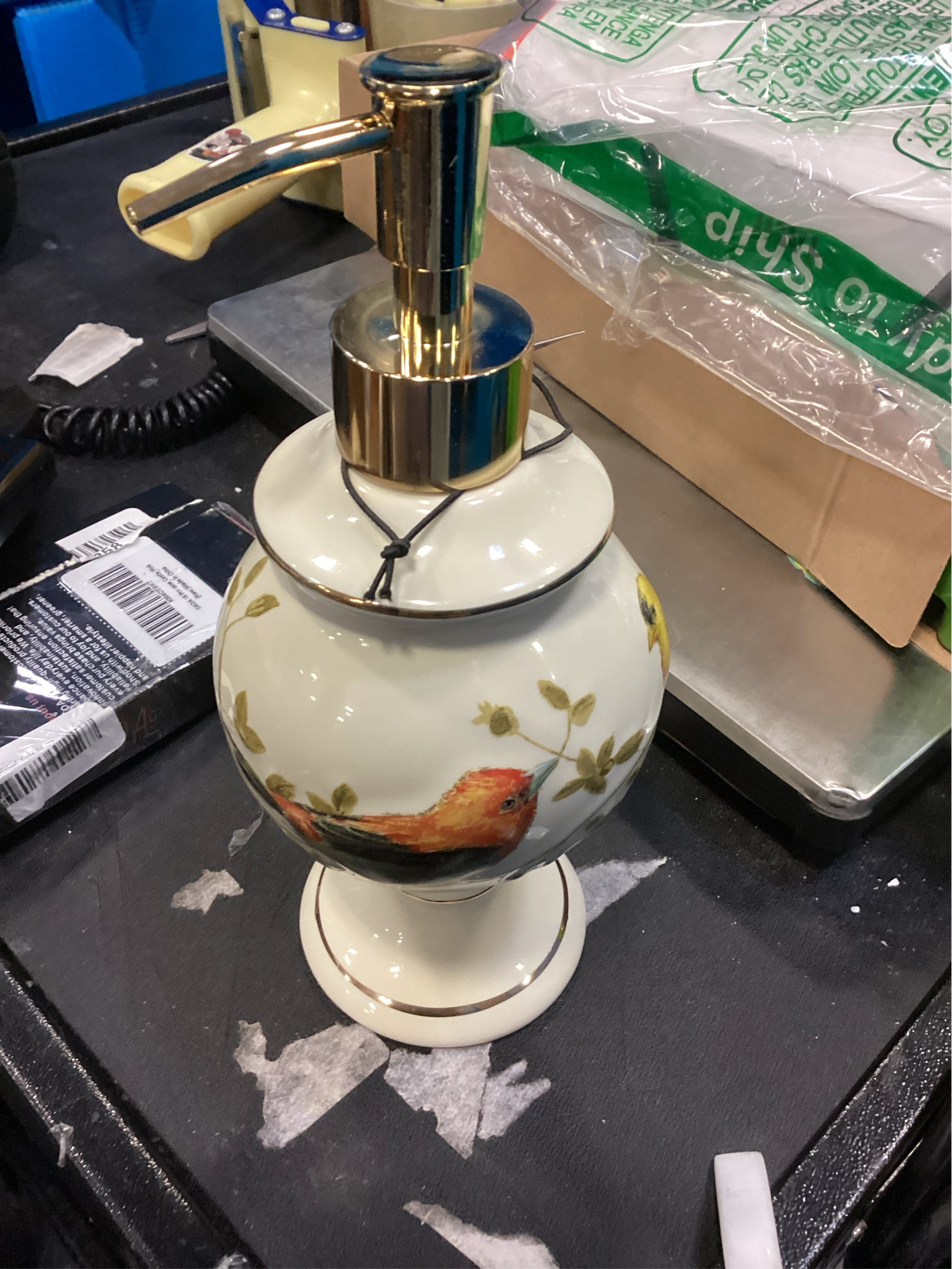 Give your bathroom a chirpy new look with Gilded Birds bath accessories featured in a colorful collection of springtime’s most beloved birds.Raised decal with a colorful bird motifDecorative gold trimAn elegant addition to any bathroomThe tumbler, toothbrush holder, soap dish, soap dispenser, tissue cover, and wastebasket are ceramicBase Material: 100% CeramicCare: Machine WashHome Accessories Type: Soap DispensersCountry of Origin: Imported