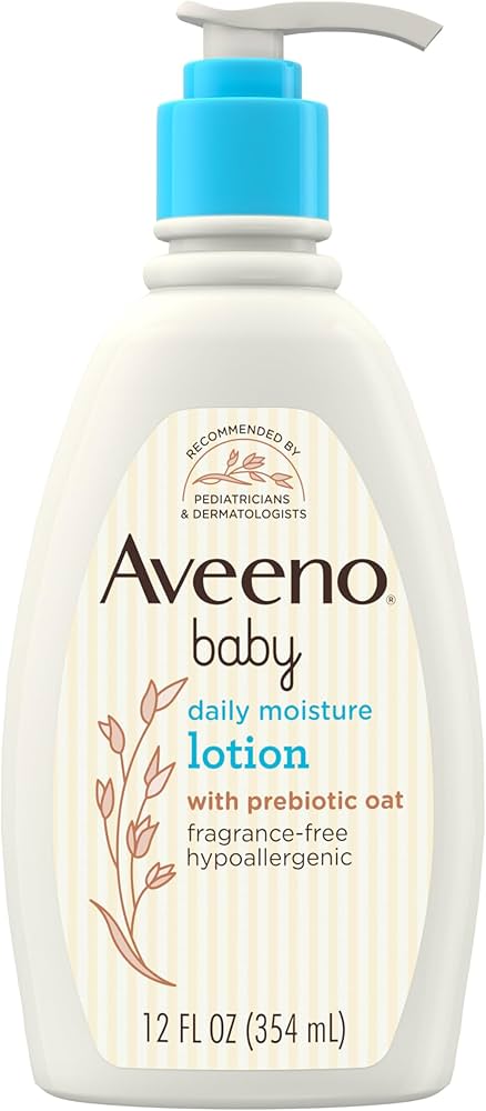 Aveeno Baby Daily Moisture Body Lotion with natural colloidal oatmeal features a nourishing, non-greasy formula that helps protect your little one's delicate skin and moisturizes for a full 24 hours. This nourishing baby moisturizing lotion is specially formulated to be gentle enough for babies. Natural colloidal oatmeal blended with dimethicone skin protectant allows this oatmeal baby body lotion to moisturize for a full 24 hours and helps prevent and temporarily protect chafed, chapped, or cracked skin. From a pediatrician-recommended brand, this hypoallergenic baby lotion can be used every day to keep your baby's skin soft, smooth, and healthy-looking. From Aveeno, a pediatrician and dermatologist-recommended brand, the non-greasy lotion formula is free from fragrance, parabens, steroids, phenoxyethanol and phthalates, so it won't irritate baby's sensitive skin. Bottle of Aveeno Baby Daily Moisture Body Lotion with natural colloidal oatmeal and rich emollients The naturally nourishing formula of this oatmeal baby lotion moisturizes for a full 24 hours Baby moisturizing lotion is specially formulated to be gentle enough for daily use Oatmeal baby lotion with natural colloidal oatmeal and dimethicone prevents and protects dry skin From a pediatrician-recommended brand, this hypoallergenic baby lotion won't irritate sensitive skin Gentle baby body lotion is free from fragrances, parabens, steroids, phenoxyethanol and phthalates Non-greasy and hypoallergenic, this daily baby lotion helps protect your baby's delicate skin Temporarily protect your baby from chafed, chapped or cracked skin with Daily Moisture Lotion
