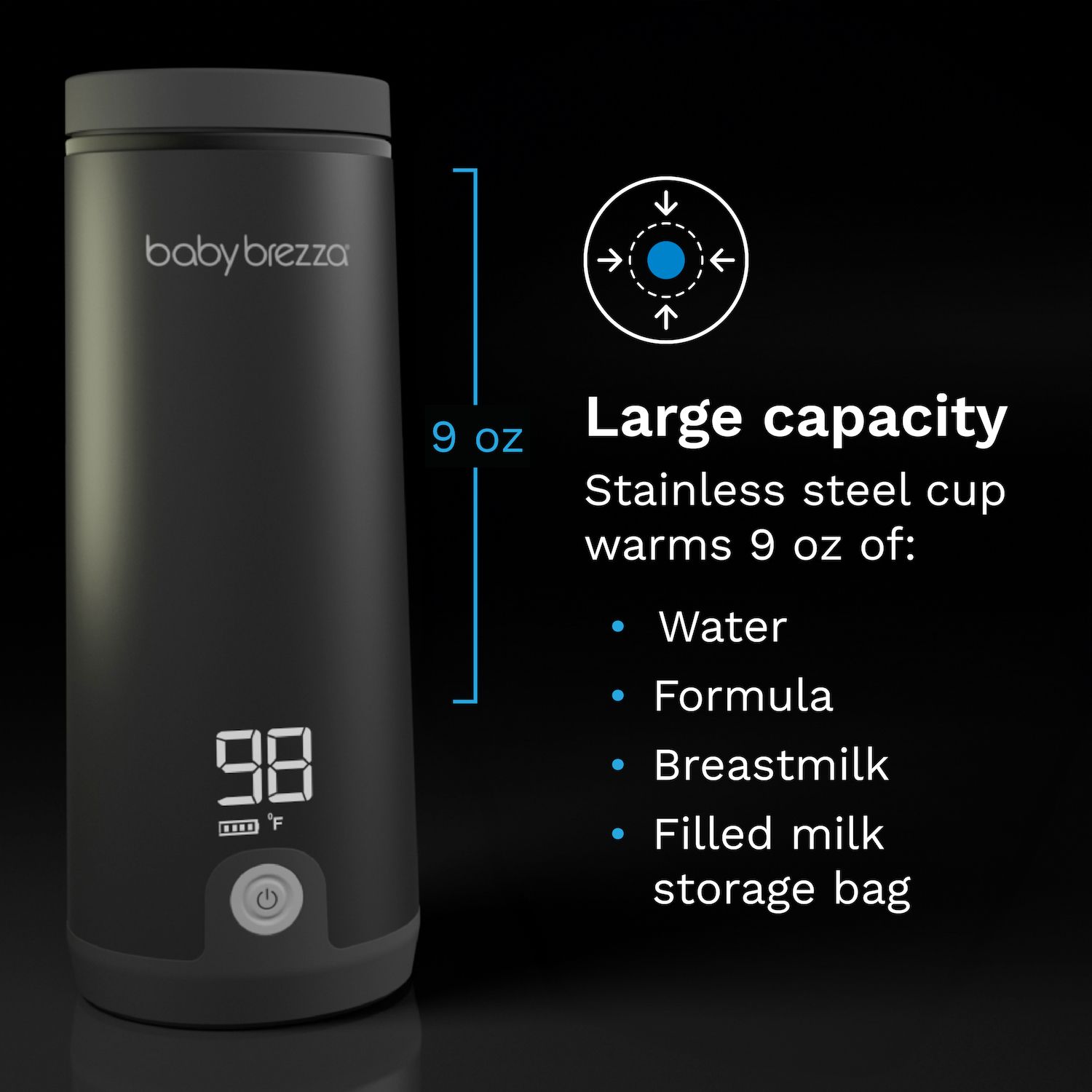 - Holds 9-oz. of water, formula, breastmilk, or a filled milk storage bag in stainless steel cup