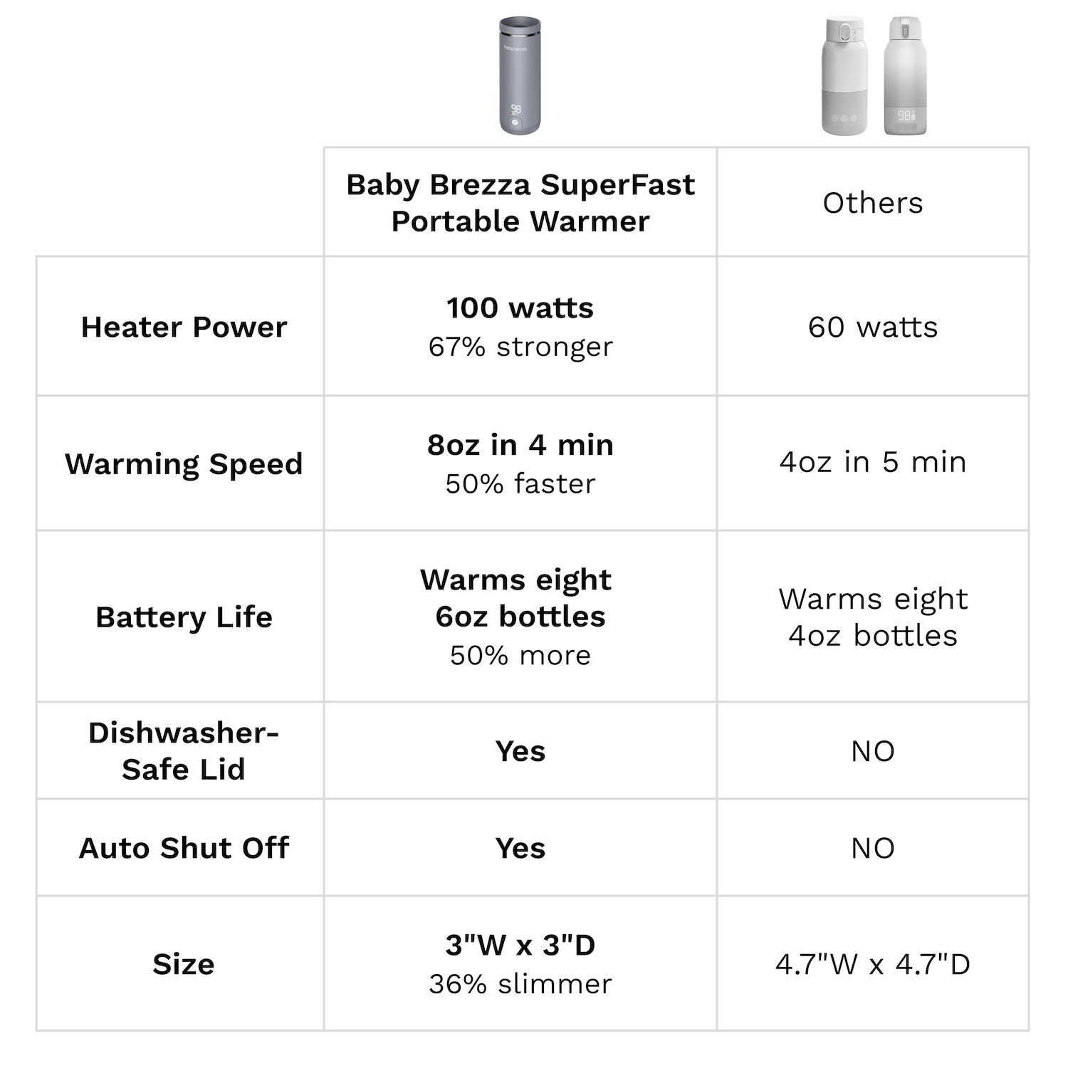- Advanced battery technology warms up to eight 6-oz. bottles on a single charge