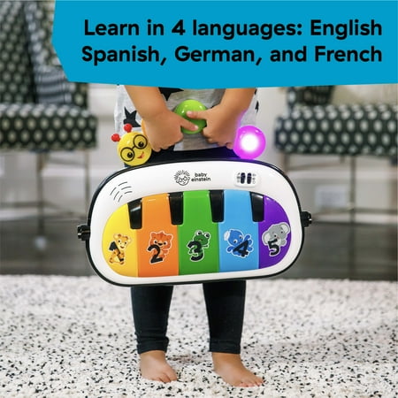 * Packaging contains scattered parts. See photos for more details. * The Baby Einstein 4-in-1 Kickin' Tunes gym entertains your newborn with 4 modes: Laying, Sitting, Tummy Time, Take-Along 70+ sounds & activities and 25+ minutes of music for endless entertainment, includes 7 detachable toys: crinkle medallion, triangle rattle, BPA-free textured music note, flash cards, self-discovery mirror, piano toy and tummy time pillow Piano toy features 2 modes of play: Free Play piano mode and Melody mode, introduces phrases in 4 languages: English, Spanish, French and German, bring the piano on the go Includes 1 prop pillow for extra tummy time support, mat is machine washable, simply remove toy bar, piano and piano legs, and toys before washing, all toys are easy to wipe clean Unisex baby gym ideal for ages 0 36 months, assembled dimensions, powered by 3 AA batteries (not included)