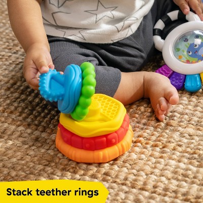 Give baby the gift of sensory discovery with the Baby Einstein Sea of Senses 3-Piece Gift Set. Baby will love to join Opus the Octopus to explore textures, learn colors, discover music, and more with this gift set. This set combines curiosity and comfort with 3 activity toys that soothe and stimulate: Outstanding Opus Sensory Rattle & Teether, Octoplush Musical Toy, and Stack & Teethe Multi-textured Teether Toy. Help baby discover cause and effect with the Octoplush. This soothing first friend encourages baby to squeeze Opus to discover music and color names in 3 languages. Offer teething relief with the BPA free Outstanding Opus Teether. Baby can explore colors or simply enjoy the 8 teething textures. Combine learning and soothing for baby with the Stack & Teethe. The 5 teether rings can be used to soothe sore gums or to help baby practice fine motor skills and color learning as they stack each ring. Grows with baby from ages 3 months to the toddler years. Dimensions: 14.5 x 6.1 x 7 inches. Octoplush includes 2 AA demo batteries. Wipe toys clean with damp cloth and mild soap. Highlights: The Baby Einstein Sea of Senses features 3 multisensory toys in 1 discovery-filled bundle Octoplush Musical Toy plays classic melodies & teaches colors in 3 languages Outstanding Opus Sensory Rattle & Teether features 8 textured arms Stack & Teethe Teether Toy features 5, stackable silicone teething rings Supports multisensory engagement, soothing, cause & effect Builds fine motor skills; Teethers are BPA free Assembled dimensions: 14.5 (L) x 6.1 (W) x 7" (H) For ages 3 months and up; makes a great gift; Each wipes clean Specifications: Number of Pieces: 1 Dimensions (Overall): 7.0 Inches (H) x 6.1 Inches (W) x 14.5 Inches (D) Weight: 1.06 Pounds Suggested Age: 0-12 Months Features: Teether, Speaks Phrases, Music, Multiple Textures, BPA-Free, Multiple Modes of Play, Multiple Activities Assembly Details: No Assembly Required Educational Focus: Sensory Development, Shapes and Colors, Foreign Language, Problem Solving Industry or Government Certifications: Meets ASTM Standards Material: Plastic Battery: 2 AA Alkaline, Required, Not Included