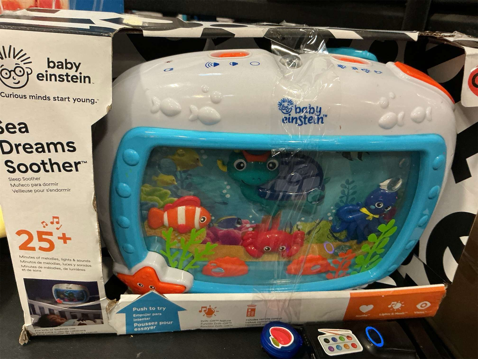 What better way to ease your little one into deep, restful sleep than the new Baby Einstein Sea Dreams Soother. You can choose from 4 different combinations of motion, lights and soundsplus there's a unique Drift-off feature that gradually softens the lights and music after each 10 minutes to help baby peacefully fall asleep. The Baby Neptune and friends characters are set in a real-life ocean background, accompanied by calming classical melodies or ocean sounds. The remote activated start allows you to avoid disturbing baby's sleep, and the Perfect Fit Universal Crib Attachment works with nearly every crib rail. Pleasant Dreams!