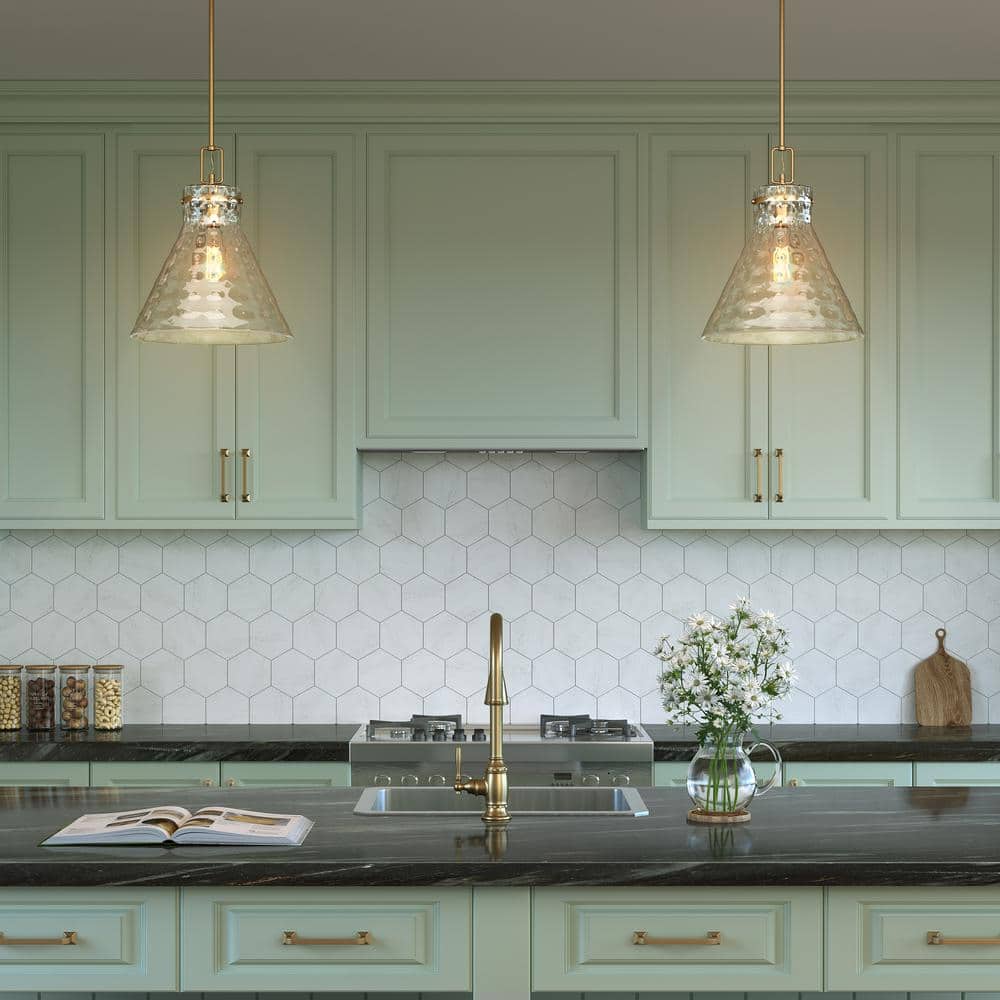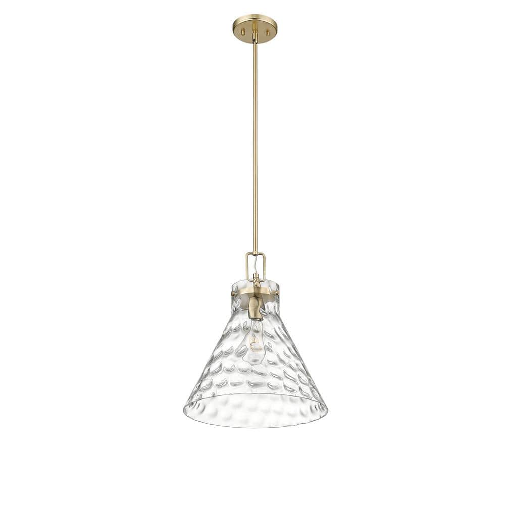 The Barlon Collection of vanity and pendant lighting provides a unique touch of style with artfully flared, clear water glass shades. The fixtures are a modern take on classic hook-style lantern lighting and are available in matte black, polished nickel, vintage brass, or modern gold with 1-light, 2-light and 3-light options. This collection is the perfect look for a modern farmhouse or industrial-style loft.. Chandelier/Pendant Design: Bulb. Compatible Bulb Type: Incandescent. Damp/Wet Rating: Damp Rated. Decorative Accents: No Decorative Accents. Dimmable Capability: Dimmable. Features: No Additional Features. Fixture Color Family: Gold. Fixture Color/Finish: Modern Gold. Fixture Material: Metal. Fixture Shape: Bell. Glass Shade Type: Clear Glass. Hanging Device: Chain. Hub Required: No hub connection available. Included: Hardware Included. Light Bulb Base Code: E26. Light Bulb Type Included: No Bulbs Included. Light Direction: Up/Down. Location Use: Dining Room,Foyer,Kitchen Island,Living Room. Max. Bulb Wattage (W): 60 W. Minimum Hanging Length (in.): 48.8 in. Number of Lights: 1. Power Options: Hardwired. Power Source: Hardwired. Product Weight (lb.): 13.64 lb. Recommended Light Bulb Shape: Candle. Recommended Light Bulb Shape Code: E26. Remote Access: No Remote Access. Requires Hub?: No Hub Required. Returnable: 90-Day. Shade Color Family: Clear. Shade Material: Glass. Shape: Dome. Voice Control Hub Required: No Voice Control. Volt (v): 120. Certifications and Listings: UL Listed. Chain Length (in.): 0 in. Fixture Height (in.): 12.8 in. Fixture Weight (lb.): 7.26 lb. Fixture Width (in.): 14 in. Maximum Hanging Length (in.): 60 in. Mounting Plate Height (in.): 0.7 in. Mounting Plate Width (in.): 5.1 in. Product Depth (in.): 5.1 in. Number of Lights: 1. Glass Shade Type: Clear Glass. Fixture Material: Metal. Shape: Dome. Chandelier/Pendant Design: Bulb. Fixture Width (In.): 14 in. Light Bulb Base Code: E26. Fixture Height (In.): 12.8 in