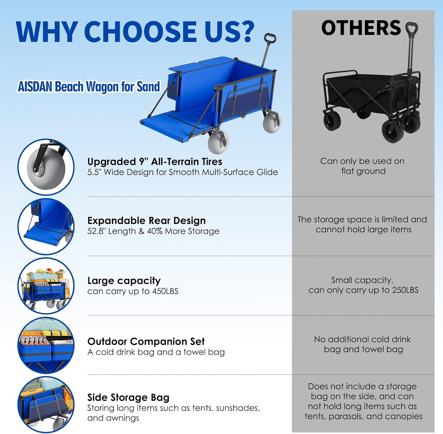 【Upgraded All-Terrain TPU Inflatable Tires (Includes Pump)】Featuring 4 detachable, non-slip wheels (9" diameter, 5.5" wide), and front wheels 360° rotating, making this wagons carts foldable ensures easy control. The upgraded TPU inflatable tires provide unmatched durability, smoother rides, and eco-friendliness compared to PVC tires. Perfect for sand, grass, gravel, and more, these tires are quiet, shock-absorbing, wear-resistant, and easy to clean, and built for beach wagons