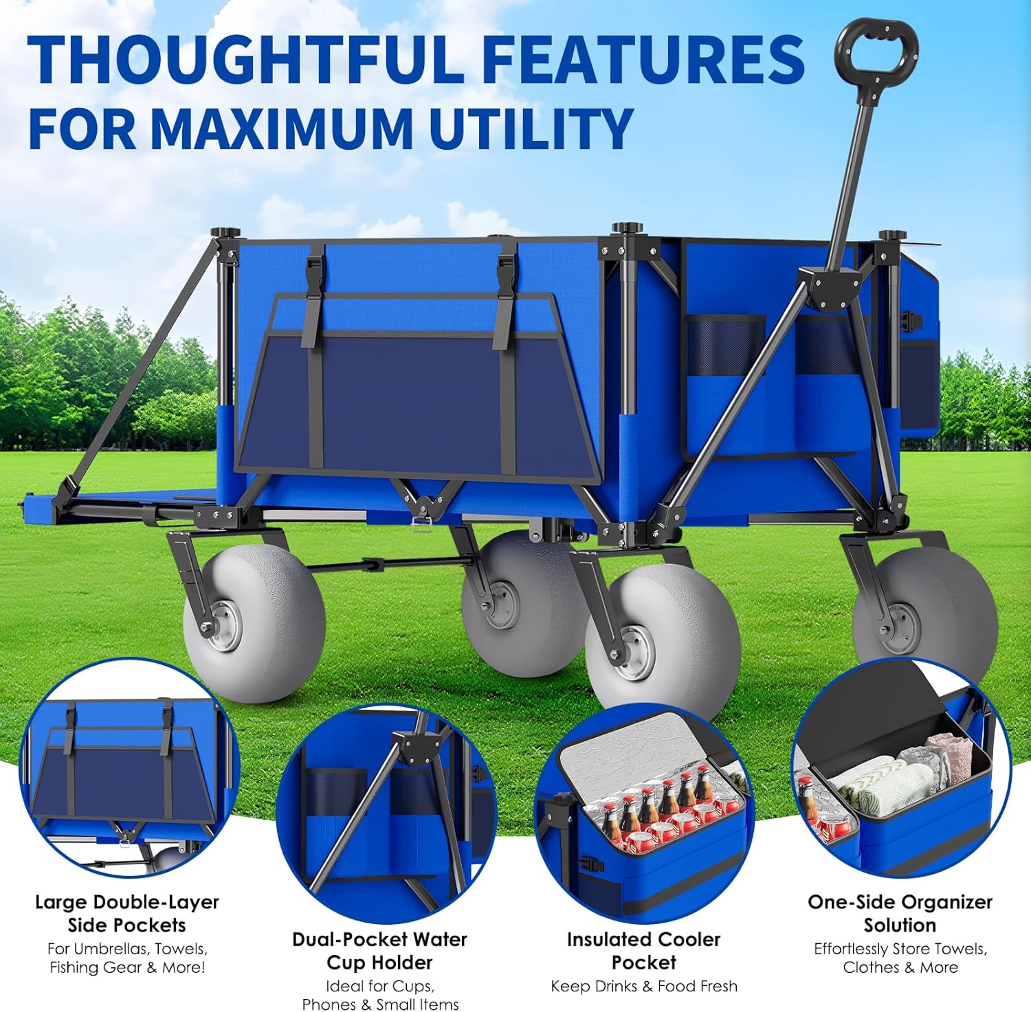 Beach Wagon with Big Wheels for Sand - 450lbs Load Heavy Duty Wagons Carts Foldable with 9" All Terrain Inflatable Tires, Collapsible Beach Cart for Grocery Shopping Garden Sports Camping Outdoor