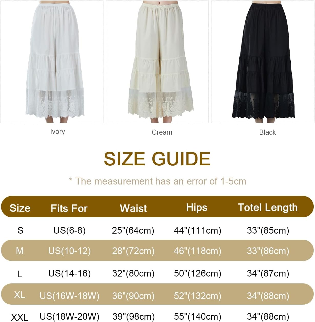 ★ ELASTIC WAIST -- The pettipants offers a comfortable fit with an elastic waistband, breezy pant legs, and lacy hem. It'll provide an extra smooth lining for slacks, skirts or capris. Not need to worry legs sticking together any more.