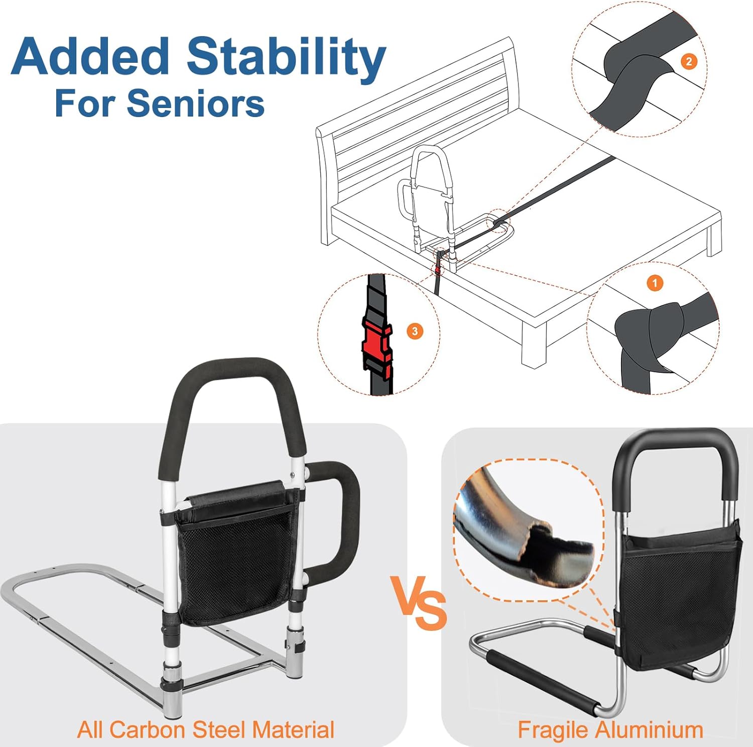Enlarged Base Size: Our bedside rails for elderly adults safety boast an enlarged base size (24.2”x11.2”) for secure placement and added stability. Plus, the innovative flat tube base prevents mattress deformation, doesn't hurt the back, and ensures restful sleep. The bed rails for queen bed including tie-down straps ensure optimum safety during use.