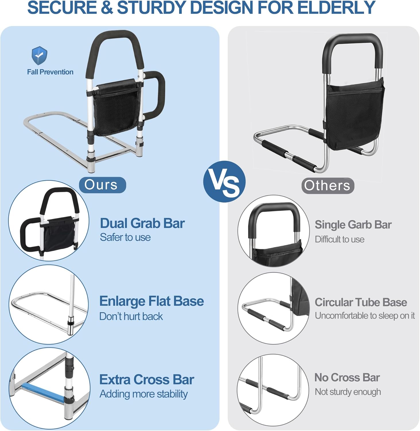 Dual Non-Slip Handles: Featuring two handles at different heights, our bed railing offers easy gripping and assistance. The soft spongy material covering the grab bar ensures optimum comfort and saves more strength for seniors during use.