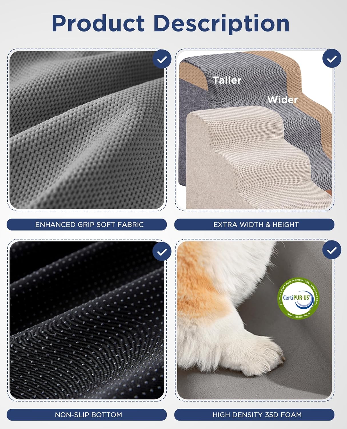 SPECIFIC AND STEADY DESIGN - 35D density of pure foam make this stair more steady when your pets walk on. The dog bed stairs can provide strong support for pets in the walking process. Low angle slope design can better protect your pet's joints.