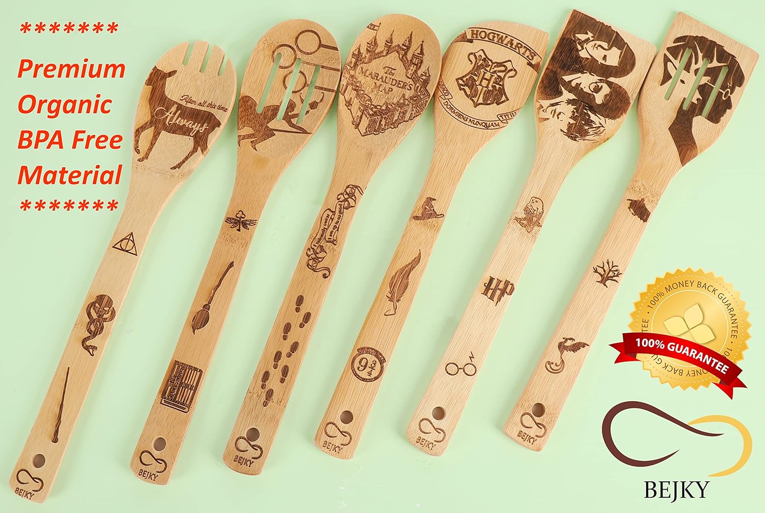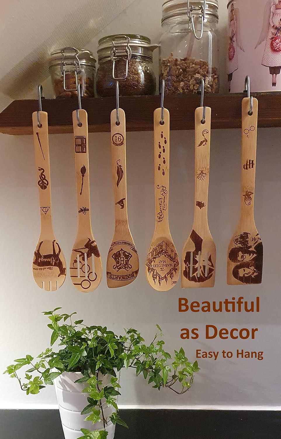 ADD THIS 6-PIECES OF MAGICAL WIZARD WOODEN BAMBOO UTENSIL SET TO YOUR HOME AND KITCHEN: Add a magical touch to your kitchen with 6 uniquely engraved wooden bamboo spatulas, each inspired by fairy tales; packed in a stylish gift box