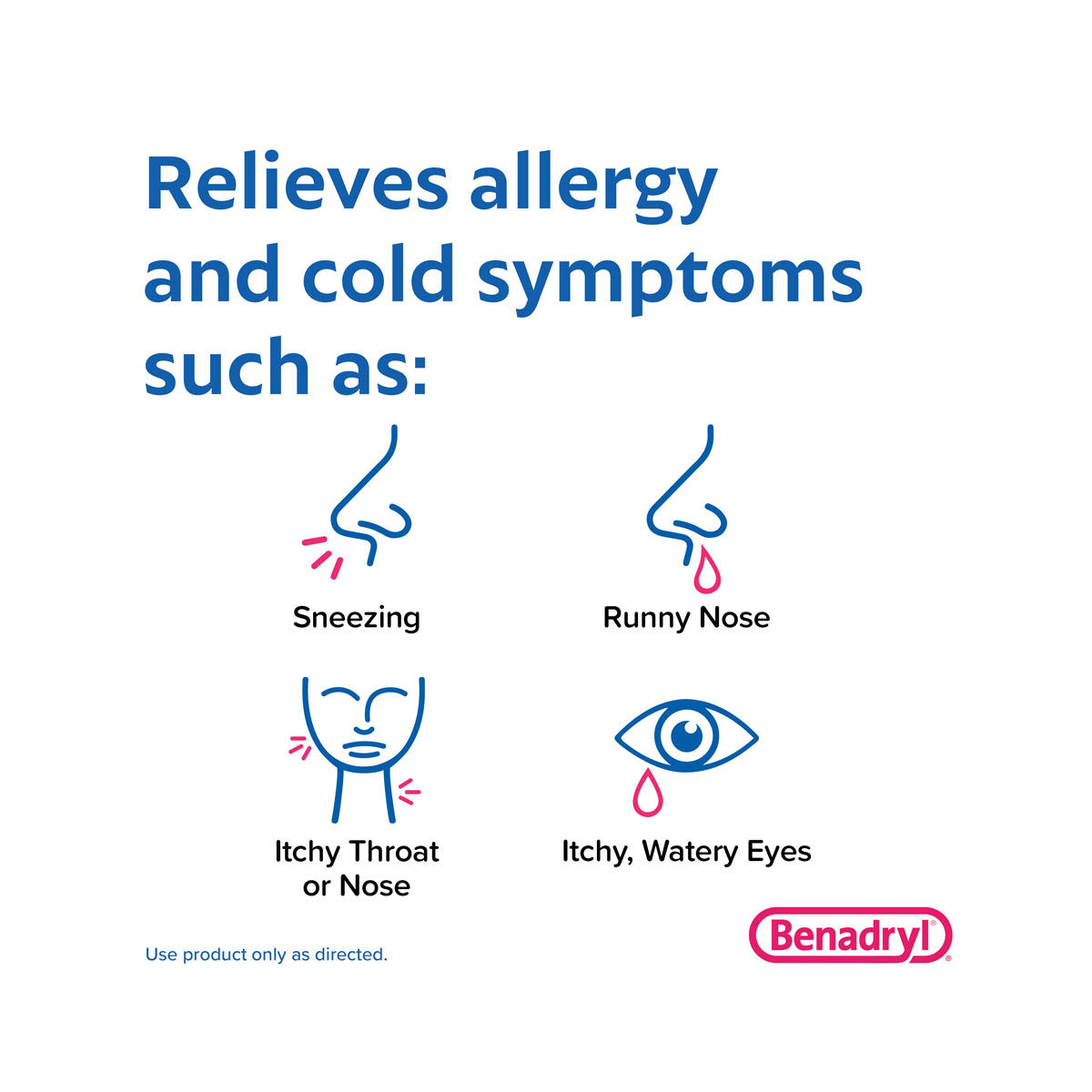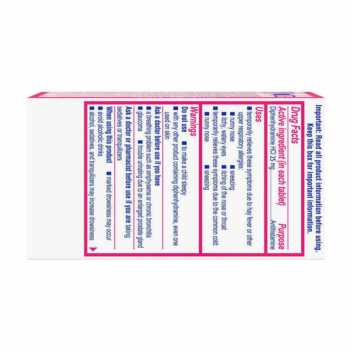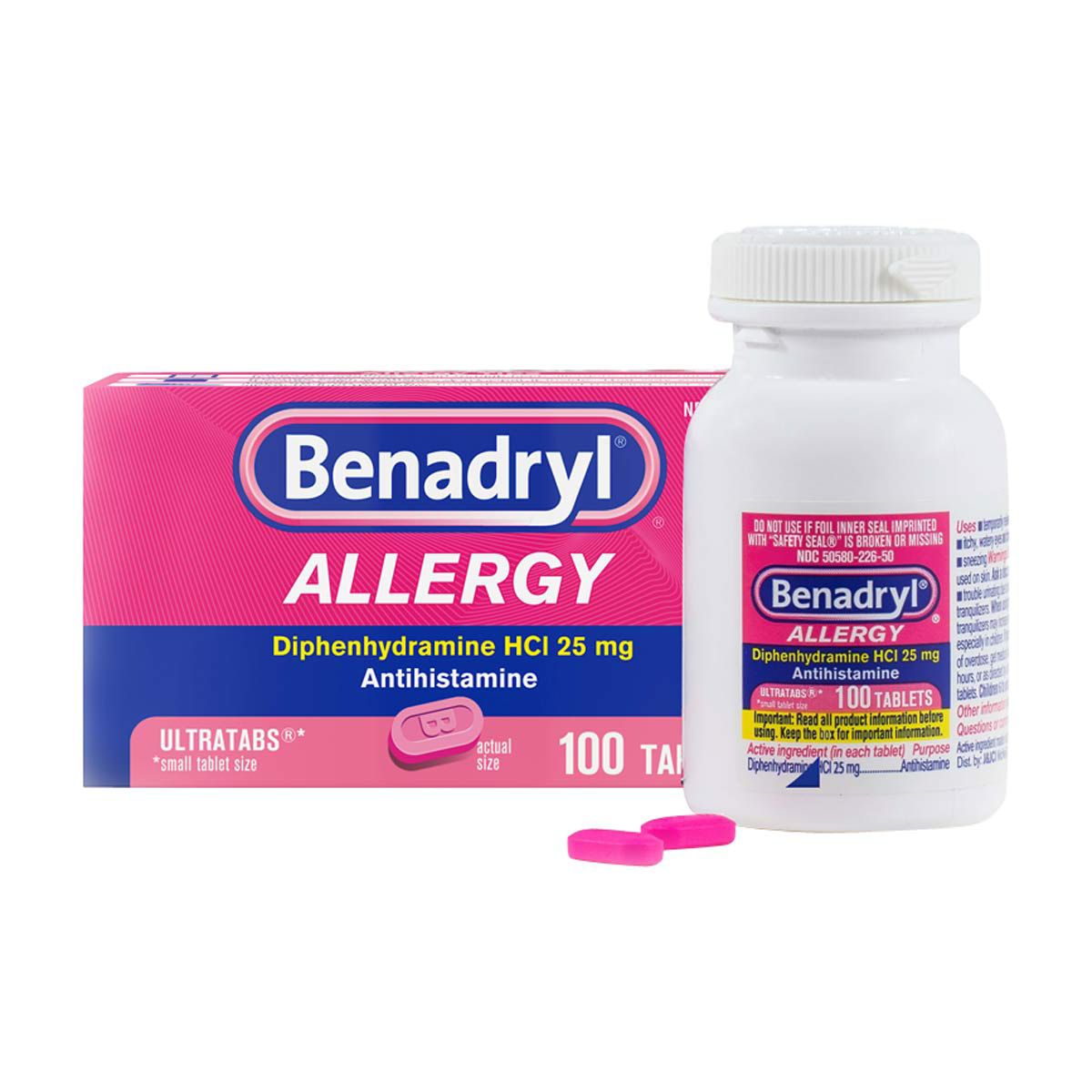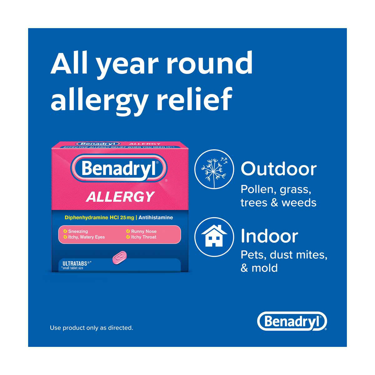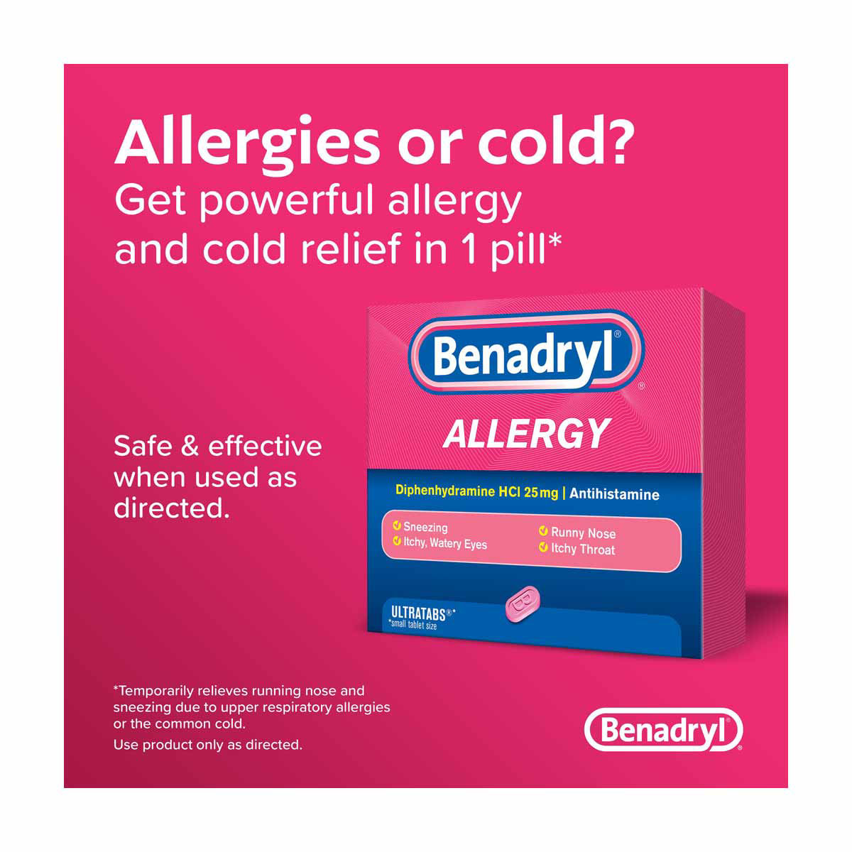 Benadryl Ultratabs Allergy Relief Tablets with 25 mg of the antihistamine diphenhydramine HClProvides powerful relief for unexpected allergies in small, oval shaped coated tabletsProvides relief of cold symptoms like sneezing & runny nose for more than just allergy reliefAllergy medicine works when you need it most & is suitable to treat adults & children ages 6 & upThe antihistamine diphenhydramine HCl provides effective relief for cold & allergy symptomsSmall antihistamine tablets offer hay fever, upper respiratory allergy & cold symptom reliefConvenient, small antihistamine tablets offer trusted allergy relief to put your allergies to restSafe & effective allergy relief in small easy-to-swallow tablet form when used as directed