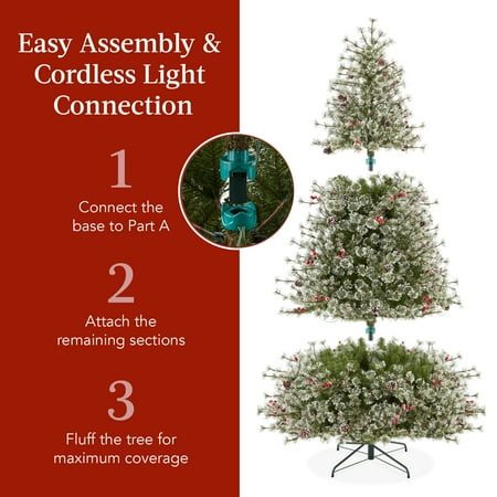SEMI-FLOCKED WEEPING PINE: Quality cashmere pine needles & PVC come together to recreate the full, dense foliage of the iconic weeping pine tree - complete with frosted tips for a stunning centerpiece that celebrates the holiday season PREMIUM DESIGN: Durable, partially flocked branches come trimmed with pine cones and artificial berries to recreate a natural look that brings an outdoor aesthetic into your decorative space EASY ASSEMBLY & CORDLESS CONNECTION: A simple 3 step assembly is made easier by an instant cordless light system-just stack the sections of the tree, fluff, and plug in the base for a dazzling display; approximate fluffing Times (6ft/7.5ft/9ft): 30-45 mins/ 45-60 mins/ 60-90 mins FULL APPEARANCE: Hundreds of tips create an even and full appearance with plenty of space for your best ornaments, garland, tinsel or DIY decor. Number of tips (6ft/7.5ft/9ft): 936 / 1,264 / 1,968 9 LIGHT FUNCTIONS: Use the foot switch to cycle between 9 light sequences as hundreds of 2-in-1 warm white and multicolored LED lights come to life and add a dynamic touch to the holidays; light counts (6ft/7.5ft/9ft): 250/550/900; OVERALL DIMENSIONS: 54"(Dia) x 72"(H) (including stand)